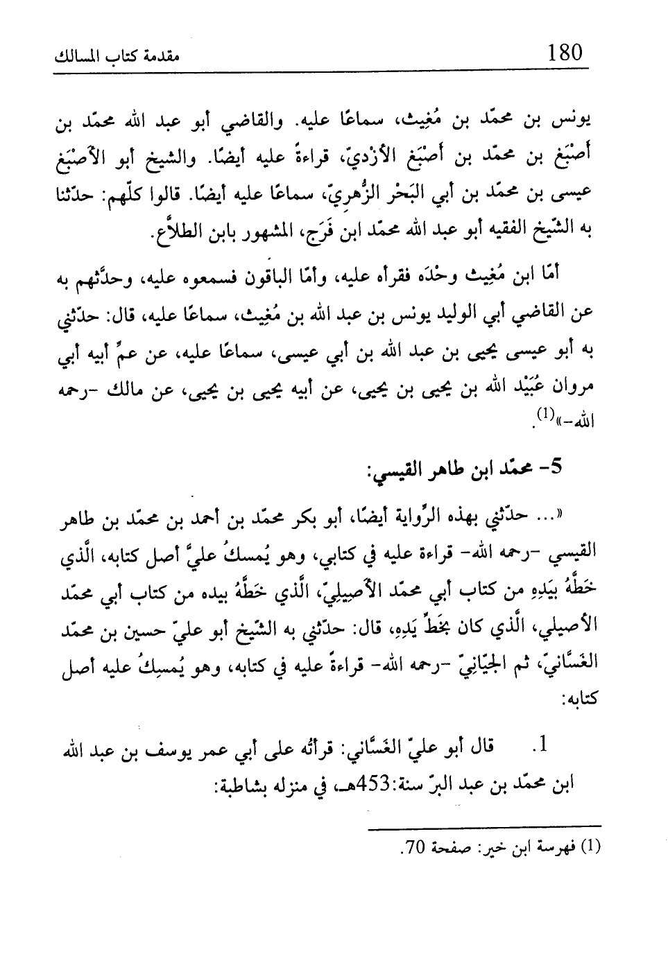 " ... حدّثني بهذه الرواية أيضًا، أبو بكر محمّد بن أحمد بن محمّد بن طاهر القيسي -رحمه الله- قراءة عليه في كتابي، وهو يُمسكُ عليَّ أصل كتابه، الَّذي خَطَّهُ بيَدِهِ من كتاب أبي محمّد الأَصِيلِيّ، الَّذي خَطَّهُ بيده من كتاب أبي محمّد الأصيلي، الَّذي كان بخَطِّ يَدهِ، قال: حدّثني به الشّيخ أبو عليّ حسين بن محمّد الغَسَّانيّ، ثم الجيّانِيّ - رحمه الله - قراءةً عليه في كتابه، وهو يُمسِكُ عليه أصل كتابه:
