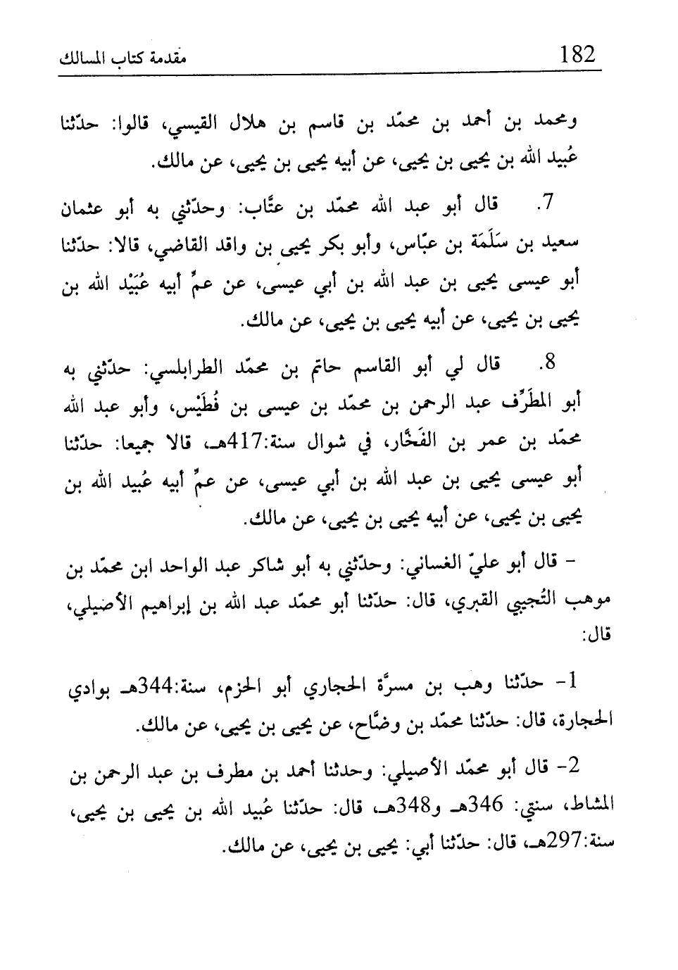 8. قال لي أبو القاسم حاتم بن محمّد الطرابلسي: حدّثني به أبو المطَرِّف عبد الرحمن بن محمّد بن عيسى بن فُطَيْس، وأبو عبد الله محمّد بن عمر بن الفَخَّار، في شوال سنة:417هـ، قالا جميعا: حدّثنا أبو عيسى يحيى بن عبد الله بن أبي عيسى، عن عمِّ أبيه عُبيد الله بن يحيى بن يحيى، عن أبيه يحيى بن يحيى، عن مالك.