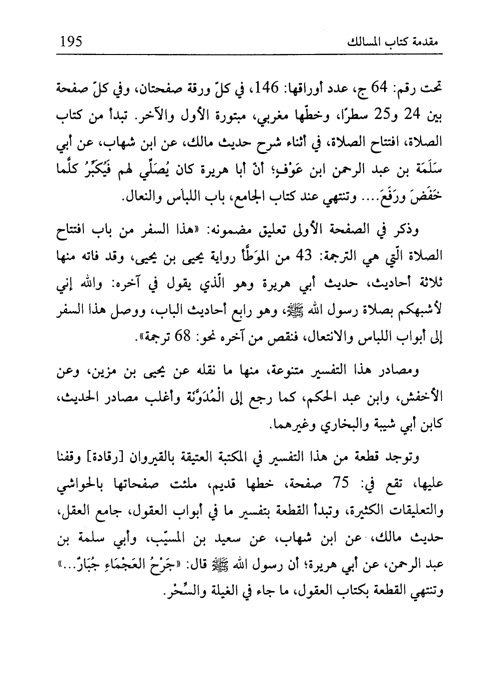 وتوجد قطعة من هذا التفسير في المكتبة العتيقة بالقيروان [رقادة] وقفنا عليها، تقع في: 75 صفحة، خطبها قديم، ملئت صفحاتها بالحواشي والتعليقات الكثيرة، وتبدأ القطعة بتفسير ما في أبواب العقول، جامع العقل، حديث مالك، عن ابن شهاب، عن سعيد بن المسيّب، وأبي سلمة بن عبد الرحمن، عن أبي هريرة؛ أن رسول الله - صلى الله عليه وسلم - قال: "جَرْحُ العَجْمَاءِ جُبَارٌ ... " وتنتهي القطعة بكتاب العقول، ما جاء في الغيلة والسِّحْر.