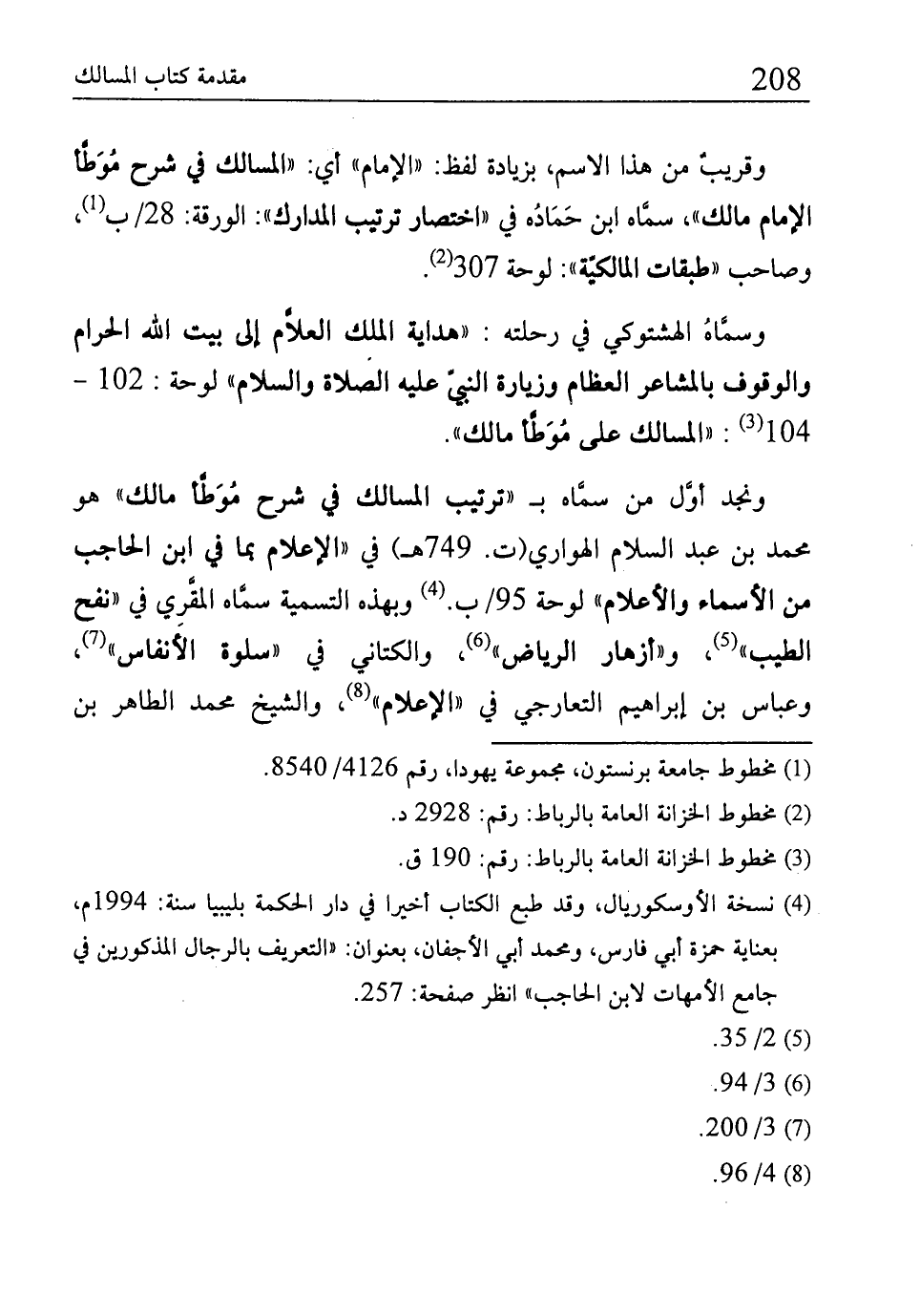 ونجد أوَّل من سماه بـ "ترتيب المسالك في شرح مُوَطَّأ مالك" هو محمَّد بن عبد السلام الهواري (ت. 749 هـ) في "الإعلام بما في ابن الحاجب من الأسماء والأعلام" لوحة 95/ ب. (¬4) وبهذه التسمية سمَّاه المقَّري في "نفح الطيب" (¬5)، و"أزهار الرياض" (¬6)، والكتاني في "سلوة الأنفاس" (¬7)، وعباس بن إبراهيم التعارجي في "الإعلام" (¬8)، والشيخ محمَّد الطاهر بن