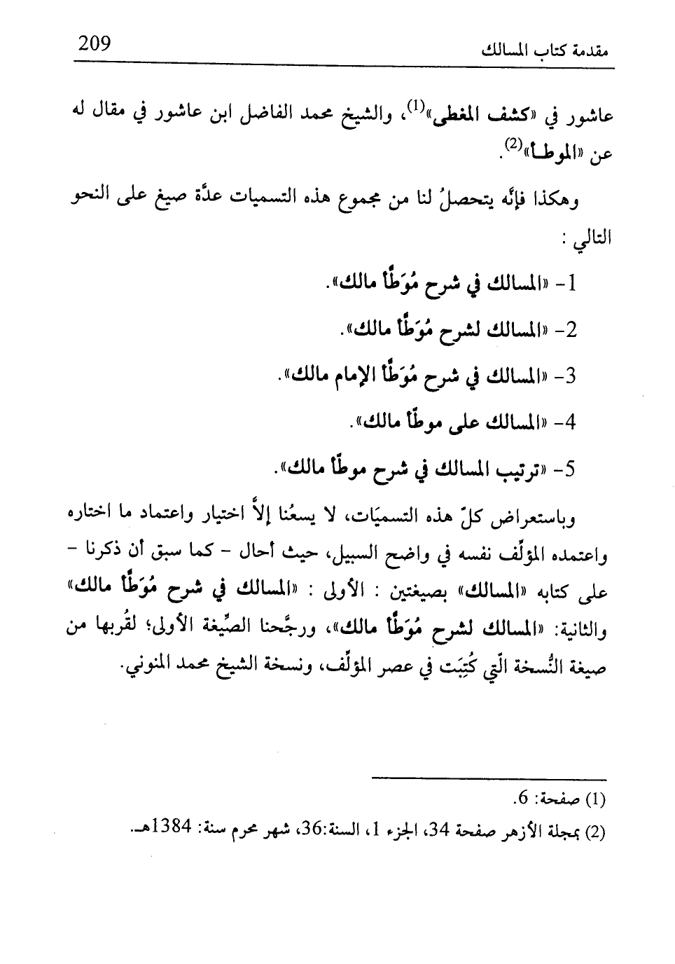 وباستعراض كلّ هذه التسميَات، لا يسعُنا إلَّا اختيار واعتماد ما اختاره واعتمده المؤلِّف نفسه في واضح السبيل، حيث أحال -كما سبق أن ذكرنا- على كتابه "المسالك" بصيغتين: الأولى: "المسالك في شرح مُوَطَّأ مالك" والثانية: "المسالك لشرح مُوَطَّأ مالك"، ورجَّحنا الصِّيغة الأولى؛ لقُربها من صيغة النُّسخة الَّتي كُتِبَت في عصر المؤلِّف، ونسخة الشيخ محمَّد المنوني.