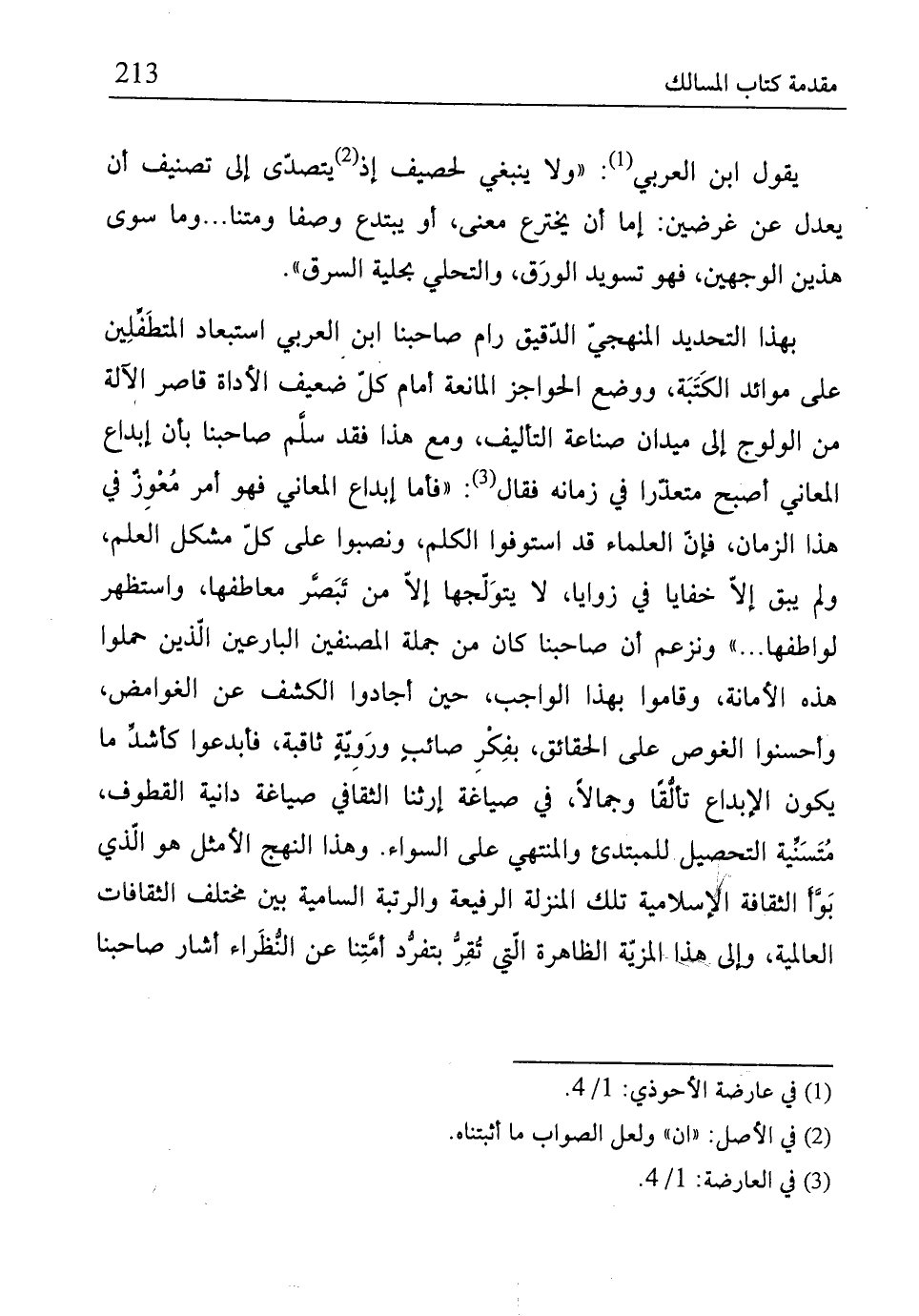 بهذا التحديد المنهجيّ الدّقيق رام صاحبنا ابن العربيّ استبعاد المتطَفِّلِين على موائد الكَتَبَة، ووضع الحواجز المانعة أمام كلّ ضعيف الأداة قاصر الآلة من الولوج إلى ميدان صناعة التأليف، ومع هذا فقد سلَّم صاحبنا بأن إبداع المعاني أصبح متعذّرا في زمانه فقال (¬3): "فأما إبداع المعاني فهو أمر مُعْوِزٌ في هذا الزمان، فإنّ العلماء قد استوفوا الكلم، ونصبوا على كلّ مشكل العلم، ولم يبق إلَّا خفايا في زوايا، لا يتوَلّجها إلّا من تَبَصَّر معاطفها، واستظهر لواطفها ... " ونزعم أن صاحبنا كان من جملة المصنفين البارعين الّذين حملوا هذه الأمانة، وقاموا بهذا الواجب، حين أجادوا الكشف عن الغوامض، وأحسنوا الغوص على الحقائق، بفِكْرِ صائبٍ ورَوِيّةٍ ثاقبة، فابدعوا كأشدِّ ما يكون الإبداع تألُّقًا وجمالًا، في صياغة إرثنا الثقافي صياغة دانية القطوف، مُتَسَنِّية التحصيل للمبتدئ والنتهي على السواء. وهذا المنهج الأمثل هو الَّذي بَوَّأَ الثقافة الإِسلامية تلك المنزلة الرفيعة والرتبة السامية بين مختلف الثقافات العالية، وإلى هذا المزيّة الظاهرة الَّتي تُقِرُّ بتفرُّد أمَّتِنا عن النُّظَراء أشار صاحبنا