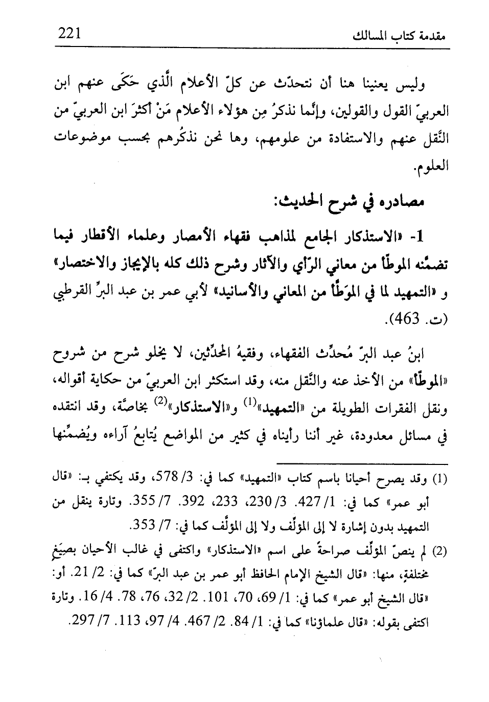(¬2) لم ينصّ المؤلِّف صراحةً على اسم "الاستذكار" واكتفى في غالب الأحيان بصِيَغٍ مختلفةٍ، منها: "قال الشيخ الإمام الحافظ أبو عمر بن عبد البرّ" كما في: 2/ 21. أو: "قال الشيخ أبو عمر" كما في: 1/ 69، 70، 101. 2/ 32، 76، 78. 4/ 16. وتارة اكتفى بقوله: "قال علماؤنا" كما في: 1/ 84. 2/ 467. 4/ 97، 113. 7/ 297.