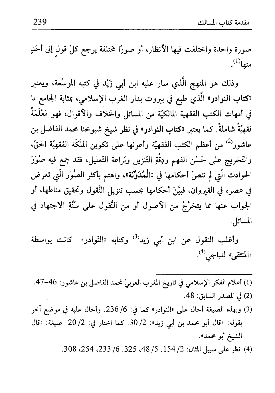 (¬3) وبهذه الصيغة أحال على "النوادر" كما في: 6/ 236. وأحال عليه في موضع آخر بقوله: "قال أبو محمَّد بن أبي زيد": 2/ 30. كما اختار في: 2/ 20 صيغة: "قال الشيخ أبو محمَّد".