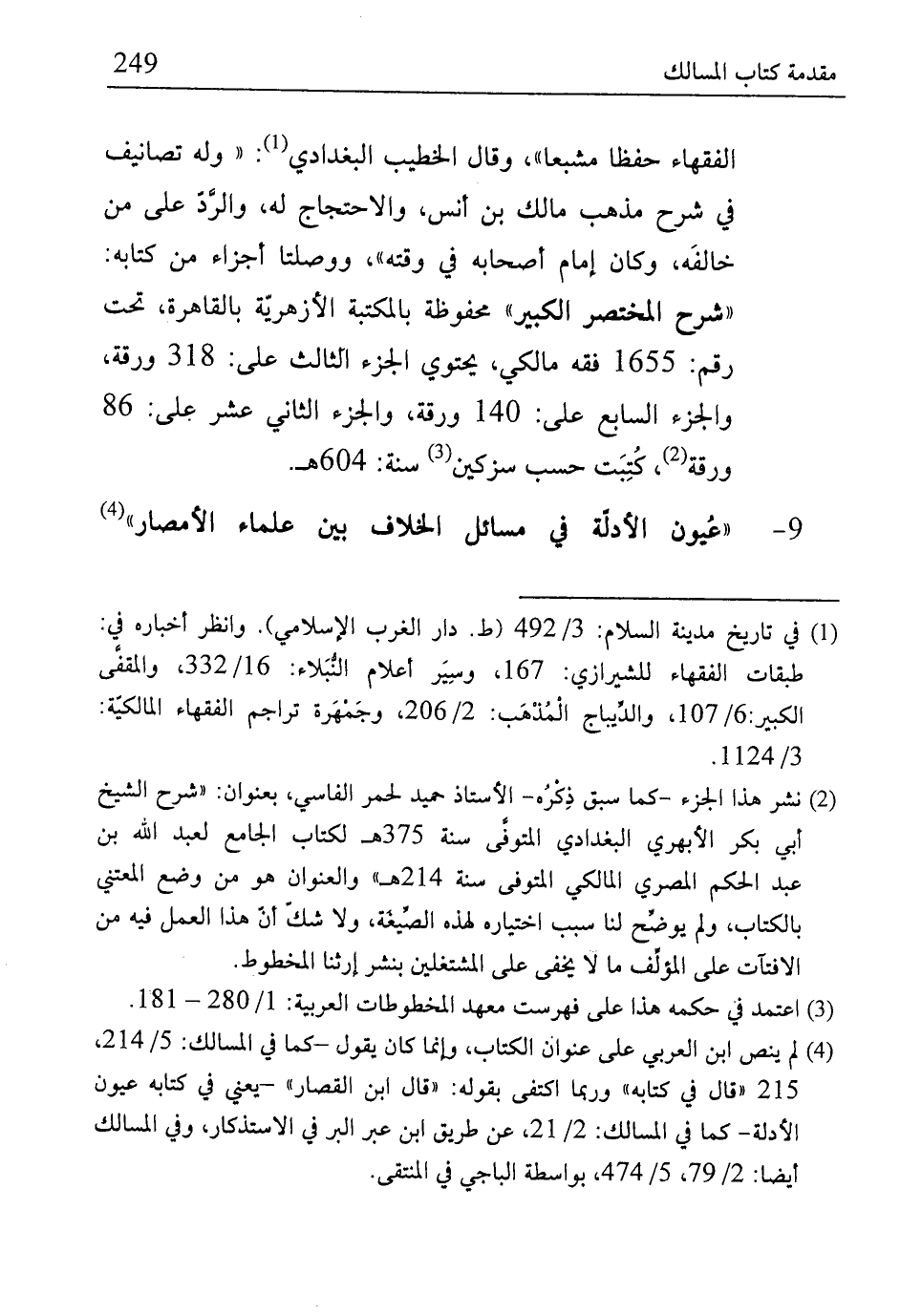الفقهاء حفظا مشبعا"، وقال الخطيب البغدادي (¬1): "وله تصانيف في شرح مذهب مالك بن أنس، والاحتجاج له، والرَّدّ على من خالفَه، وكان إمام أصحابه في وقته"، ووصلتا أجزاء من كتابه: "شرح المختصر الكبير" محفوظة بالمكتبة الأزهريّة بالقاهرة، تحت رقم: 1655 فقه مالكي، يحتوي الجزء الثالث على: 318 ورقة، والجزء السابع على: 140 ورقة، والجزء الثاني عشر على: 86 ورقة (¬2)، كُتِبَت حسب سزكين (¬3) سنة: 604 هـ