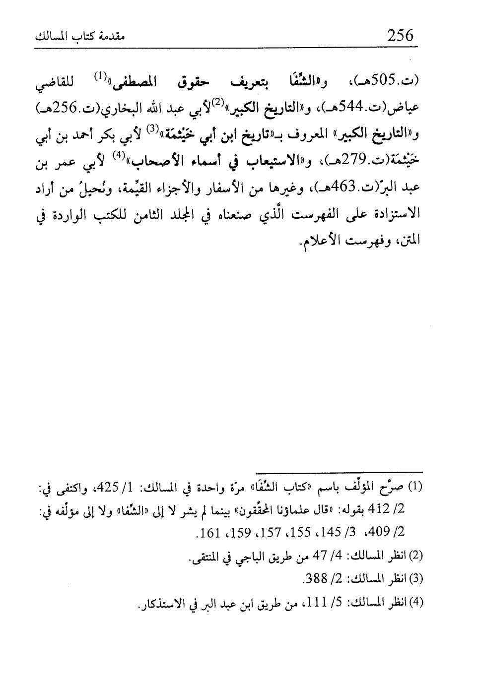 (ت.505 هـ)، و"الشِّفَا بتعريف حقوق المصطفى" (¬1) للقاضي عياض (ت.544 هـ)، و"التاريخ الكبير" (¬2) لأبي عبد الله البخاري (ت.256 هـ) و"التاريخ الكبر" المعروف بـ "تاريخ ابن أبي خَيْثمَة" (¬3) لأبي بكر أحمد بن أبي خَيْثمَة (ت.279 هـ)، و"الاستيعاب في أسماء الأصحاب" (¬4) لأبي عمر بن عبد البرّ (ت.463 هـ)، وغيرها من الأسفار والأجزاء القيِّمة، ونُحيلُ من أراد الاستزادة على الفهرست الَّذي صنعناه في المجلد الثامن للكتب الواردة في المتن، وفهرست الأعلام.