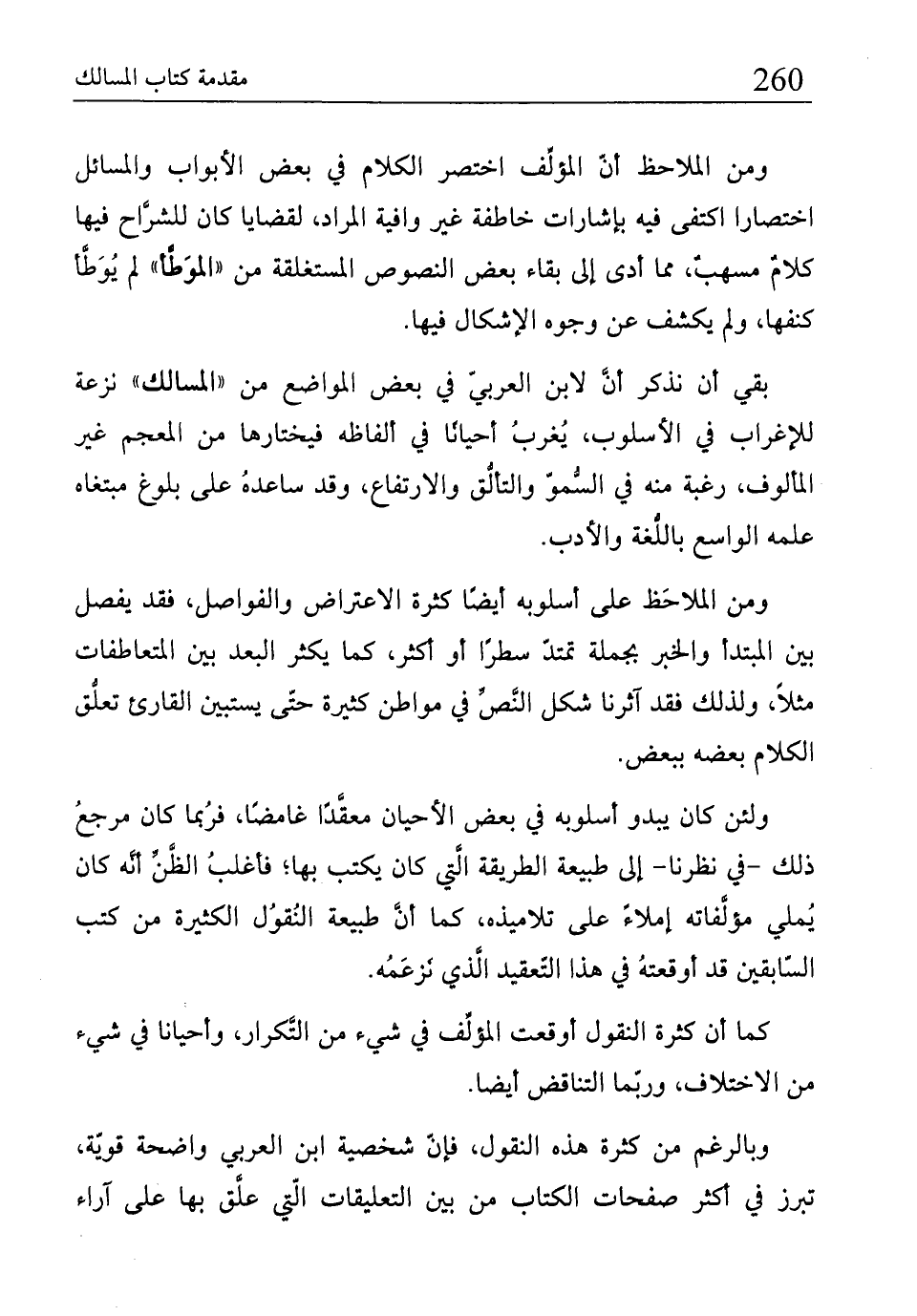 بقي أن نذكر أنُّ لابن العربيّ في بعض المواضع من "المسالك" نزعة للإغراب في الأسلوب، يُغربُ أحيانًا في ألفاظه فيختارها من المعجم غير المألوف، رغبة منه في السُّموّ والتألُّق والارتفاع، وقد ساعدهُ على بلوغ مبتغاه علمه الواسع باللُّغة والأدب.