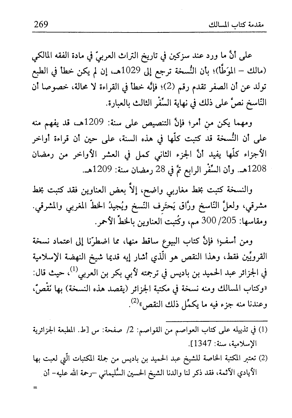 ومن أسفٍ؛ فإنَّ كتاب البيوع ساقط منها، مما اضطرّنا إلى اعتماد نسخة القرويِّين فقط، وهذا النقص هو الَّذي أشار إليه قديما شيخ النهضة الإِسلامية في الجزائر عبد الحميد بن باديس في ترجمته لأبي بكر بن العربيّ (¬1)، حيث قال: "وكتاب المسالك ومنه نسخة في مكتبة الجزائر (يقصد هذه النُّسخة) بها نقْصٌ، وعندنا منه جزء فيه ما يكمِّل ذلك النقص" (¬2).