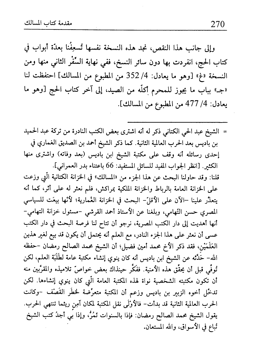 قلنا: وقد حاولنا البحث عن هذا الجزء من "المسالك" في الخزانة الكتانية الّتي وزعت على الخزانة العامة بالرباط والخزانة الملكية بمراكش، فلم نعثر له على أثر، كما أنه يتعذَّر علينا -الآن على الأقلّ- البحث في الخزانة الغُمارية؛ لأنّها بيعَت للسياسي المصري حسن التّهامي، وبلغنا عن الأستاذ أحمد القرشي -مسئول خزانة التهامي- أنها أهديت إلى دار الكتب المصرية، نرجو أن تتاح لنا فرصة البحث في دار الكتب عسى أن نعثر على هذا الجزء النادر، مع العلم أنه يحتمل أن يكون قد بيع لغير هذين العَلَمَيْنِ، فقد ذكر الأخ محمَّد أمين فضيل؛ أن الشيخ محمَّد الصالح رمضان -حفظه الله- حَدَّثه عن الشيخ ابن باديس أنه كان ينوي إنشاء مكتبة عامة لطَلَبَة العلم، لكن تُوفي قبل أن يحقِّق هذه الأمنية. ففَكَّر حينذاك بعض خواصّ تلاميذه والمقربَّين منه أن تكون مكتبته الشخصية نواة لهذه المكتبة العامة الَّتي كان ينوي إنشاءها. لكن تدخَّل أخوه الزبير بن باديس وزعم أن المكتبة متعرِّضة لخطَر القَصْف - وكانت الحرب العالمية الثانية قد بدأت- فالأوْلَى نقل المكتبة لمكان آمِنٍ ريثما تنتهي الحرب. يقول الشيخ محمَّد الصالح رمضان: فهذا بالسنوات تَمُرُّ، وإذا بي أجدُ كتب الشيخ تُباع في الأسواق، والله المستعان.