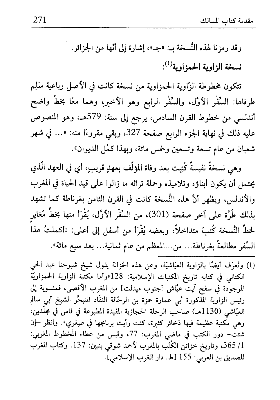 (¬1) وتُعرَف أيضًا بالزاوية العيّاشية، وعن هذه الخزانة يقول شيخ شيوخنا عبد الحي الكتاني في كتابه تاريخ المكتبات الإِسلامية: 128"وأما مكتبة الزاوية الحمزاويّة الموجودة في سفح آيت عيَّاش [جنوب ميدلت] من المغرب الأقصى، فمنسوبة إلى رئيس الزاوية المذكورة أبي عمارة حمزة بن الرحّالة النقّاد المتبحِّر الشيخ أبي سالم العيّاشي (1130 هـ) صاحب الرحلة الحجازية المفيدة المطبوعة في فاس في مجلّدين، وهي مكتبة عظيمة فيها ذخائر كثيرة، كنت رأيت برنامجها في صِغري". وانظر -إن شئت- دور الكتب في ماضي المغرب: 77، وقبس من عطاء المَخطوط المغربي: 1/ 365, وتاريخ خزائن الكُتُب بالمغرب لأحمد شوقي بنبين: 137. وكتاب المغرب للصديق بن العربيّ: 155 [ط. دار الغرب الإِسلامي].