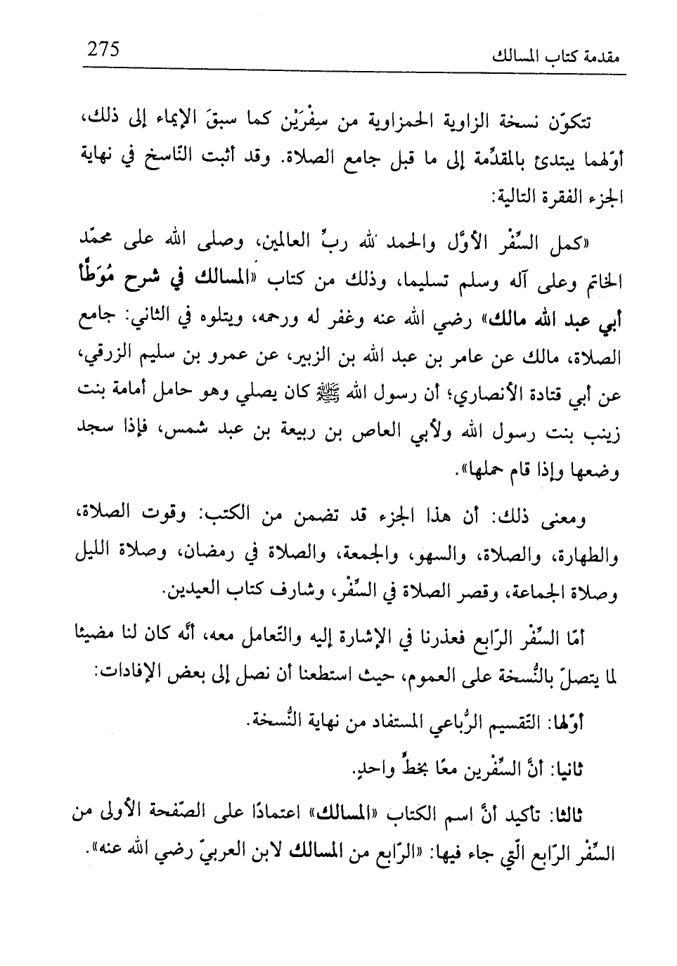 "كمل السِّفْر الأوَّل والحمد لله ربِّ العالمين، وصلى الله على محمّد الخاتم وعلى آله وسلم تسليما، وذلك من كتاب "المسالك في شرح مُوَطَّأ أبي عبد الله مالك" رضي الله عنه وغفر له ورحمه، ويتلوه في الثاني: جامع الصلاة، مالك عن عامر بن عبد الله بن الزبير، عن عمرو بن سليم الزرقي، عن إبي قتادة الأنصاري؛ أن رسول الله - صلى الله عليه وسلم - كان يصلي وهو حامل إمامة بنت زينب بنت رسول الله ولأبي العاص بن ربيعة بن عبد شمس، فإذا سجد وضعها وإذا قام حملها".