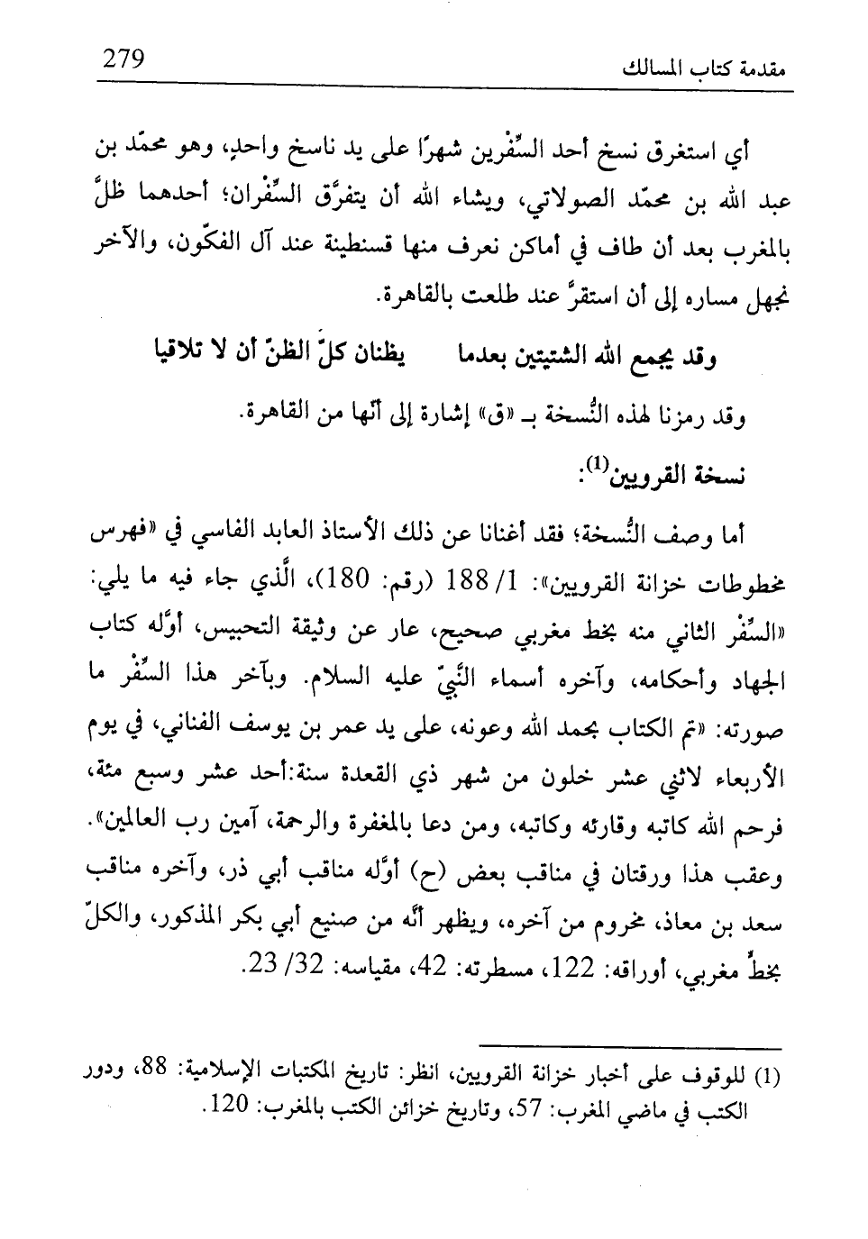 أي استغرق نسخ أحد السِّفْرين شهرًا على يد ناسخ واحدٍ، وهو محمّد بن عبد الله بن محمّد الصولاتي، ويشاء الله أن يتفرَّق السِّفْران؛ أحدهما ظلَّ بالغرب بعد أن طاف في أماكن نعرف منها قسنطينة عند آل الفكّون، والآخر نجهل مساره إلى أن استقرَّ عند طلعت بالقاهرة.
