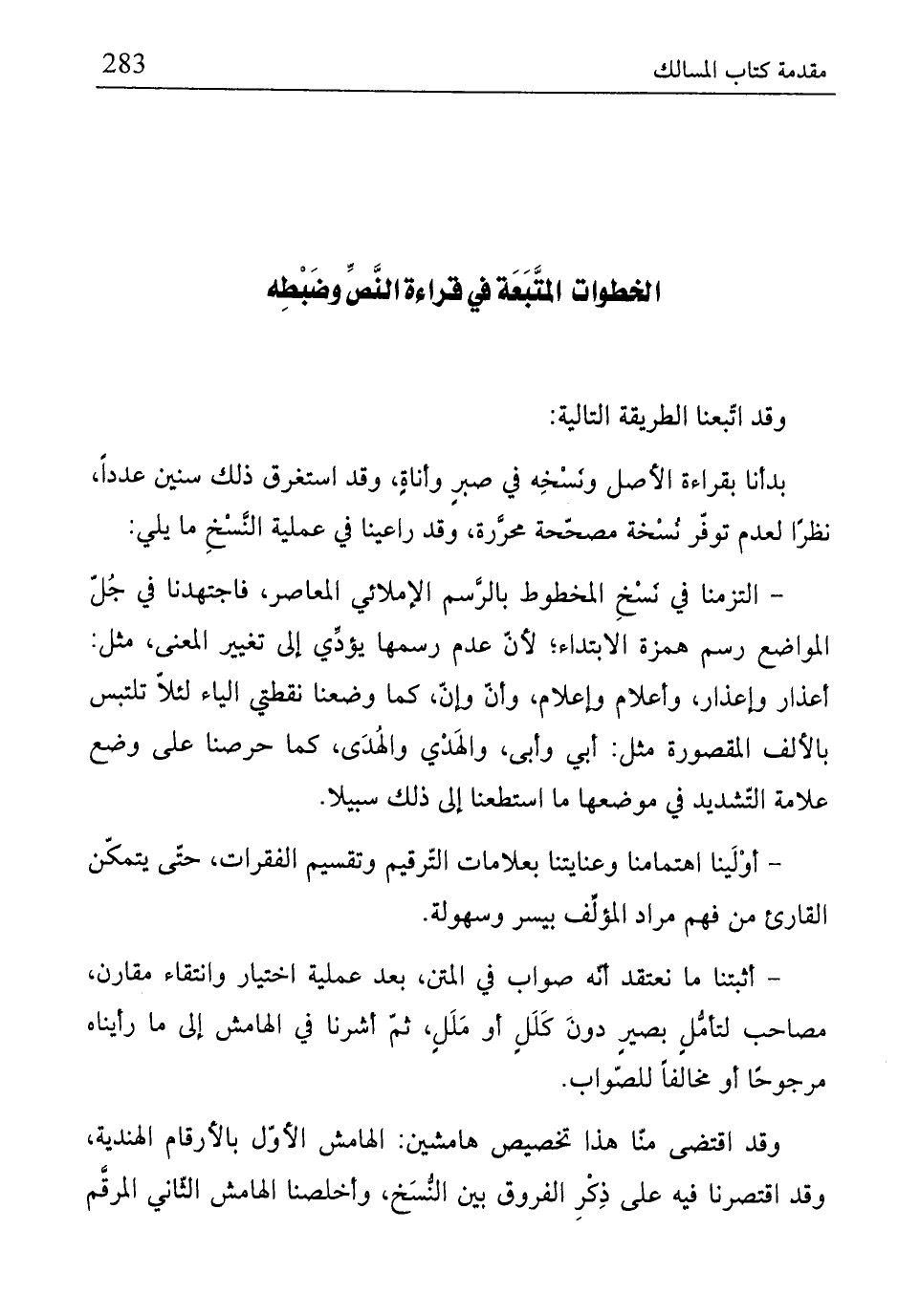 - التزمنا في نسْخِ المخطوط بالرَّسم الإملائي المعاصر، فاجتهدنا في جُلّ الواضع رسم همزة الابتداء؛ لإنّ عدم رسمها يؤدِّي إلى تغيير المعنى، مثل: أعذار وإعذار، وأعلام وإعلام، وأنّ وإنّ، كما وضعنا نقطتي الياء لئلّا تلتبس بالألف المقصورة مثل: أبي وأبى، والهَدْي والهُدَى، كما حوصنا على وضع علامة التّشديد في موضعها ما استطعنا إلى ذلك سبيلا.