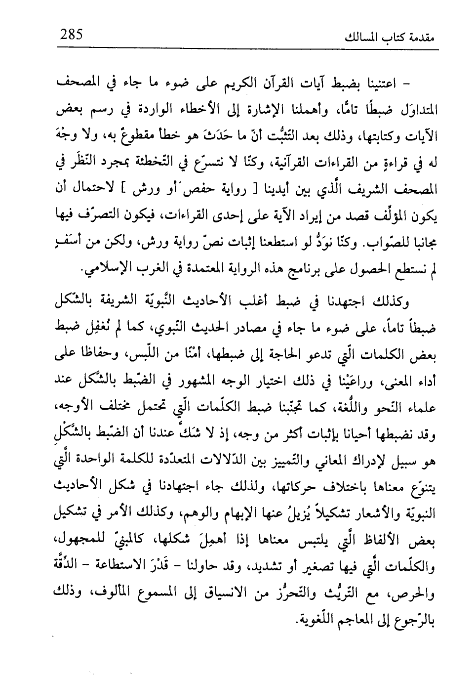 - اعتنينا بضبط آيات القرآن الكريم على ضوء ما جاء في الصحف المتداوَل ضبطًا تامًّا، وأهملنا الإشارة إلى الأخطاء الواردة في رسم بعض الآيات وكتابتها، وذلك بعد التّثبُّت إنّ ما حَدَثَ هو خطأ مقطوعٌ به، ولا وجْهَ له لا قراءةٍ من القراءات القرآنية، وكنّا لا نتسرّع لا التّخطئة بمجرد النّظَر في الصحف الشريف الَّذي بين أيدينا [رواية حفص أو ورش] لاحتمال أنّ يكون المؤلِّف قصد من إيراد الآية على إحدى القراءات، فيكون التصرّف فيها مجانبا للصّواب. وكنّا نوَدُّ لو استطعنا إثبات نصّ رواية ورش، ولكن من أسَفٍ لم نستطع الحصول على برنامج هذه الرِّواية المعتمدة في الغرب الإِسلامي.
