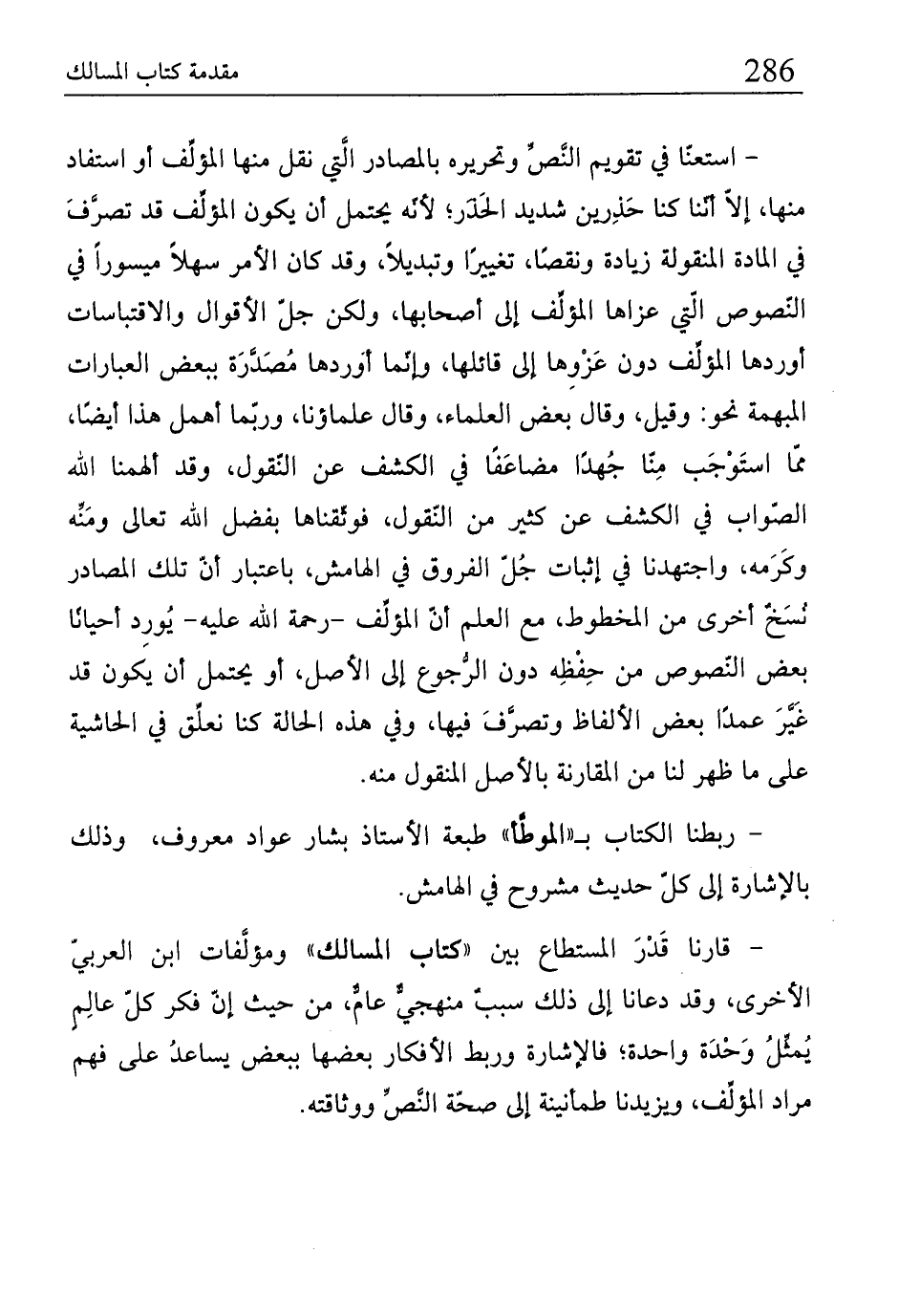 - قارنا قَدْرَ المستطاع بين "كتاب المسالك" ومؤلِّفات ابن العربيّ الأخرى، وقد دعانا إلى ذلك سببٌ منهجيٌّ عامٌّ، من حيث إن فكر كلّ عالِمٍ يُمثِّلُ وَحْدَة واحدة؛ فالإشارة وربط الأفكار بعضها ببعض يساعدُ على فهم مراد المؤلِّف، ويزيدنا طمأنينة إلى صحّة النَّصِّ ووثاقته.