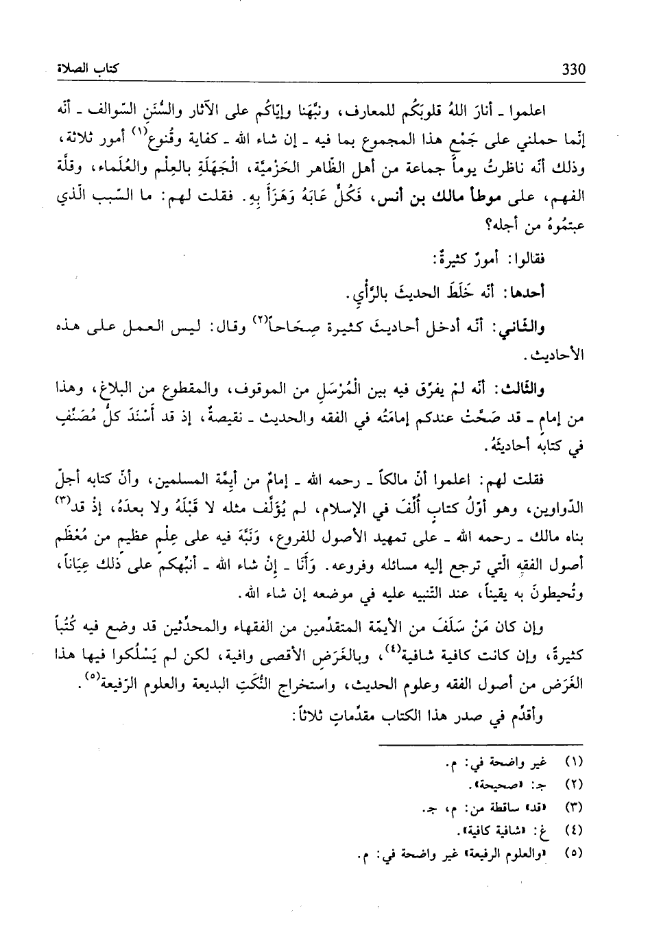 فقلت لهم: اعلموا أنّ مالكًا - رحمه الله - إمامٌ من أيِمَّة المسلمين، وأنّ كتابه أجلّ الدّواوين، وهو أوَّلُ كتاب أُلِّفَ في الإسلام، لم يُؤَلَّف مثله لا قَبْلَهُ ولا بعدَهُ، إذْ قد بناه مالك - رحمه الله - على تمهيد الأصول للفروع، وَنَبَّهَ فيه على عِلْمٍ عظيمٍ من مُعْظَم أصول الفقه التي ترجع إليه مسائله وفروعه. وَأَنَا - إِنْ شاء الله- أنبِّهكمَ على ذلك عِيَانًا، وتُحيطونَ به يقينًا، عند التّنبيه عليه في موضعه إن شاء الله.