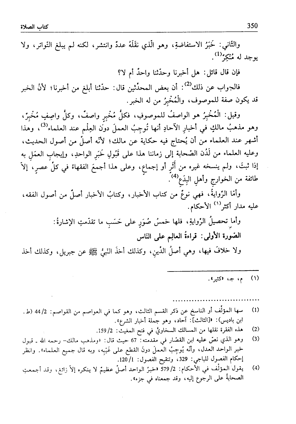 (¬3) وهو الَّذي نصَّ عليه ابن القصّار في مقدمته: 67 حيث قال "ومذهب مالك - رحمه الله - قبول خبر الواحد العدل، وأنّه يُوجِبُ العملَ دونَ القطع على غيْبِه، وبه قال جميع العلماء". وانظر إحكام الفصول للباجي: 329، وتنقيح الفصول: 1/ 120.