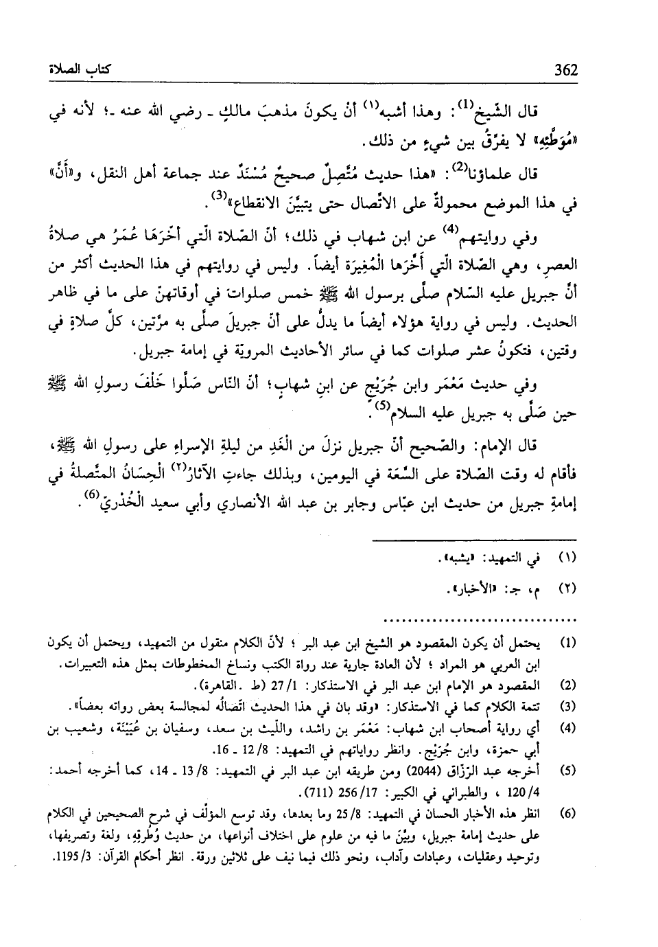 (¬1) يحتمل أنّ يكون المقصود هو الشيخ ابن عبد البر؛ لأنّ الكلام منقول من التمهد، ويحتمل أنّ يكون ابن العربي هو المراد؛ لأن العادة جارية عند رواة الكتب ونساخ المخطوطات بمثل هذه التعبيرات.