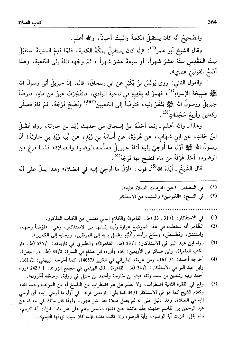 (¬5) وقع في الفقرة التّالية اضطراب، ولا نعلم هل هو اضطراب من الناسخ أم من المؤلف رحمه الله، وكلام الشيخ كما هو في الاستذكار 1/ 34 كما يلي: ومعنى قوله: في أول ما أوحي إليه، أي أوحي إليه في الصلاة. وهذا دليل على أنه لم يصل صلاة قط بغير طهور، ولهذا قال مالك في حديثه عن عبد الرحمن بن القاسم حديث عِقْدِ عائشة حين فقدوا الشمس وهم على غير ماء: فنزلت آية التيمم، ولم يقل: فنزلت آية الوضوء، وآية الوضوء وإن كانت مدنية فإنما كان سبب نزولها التيمم".