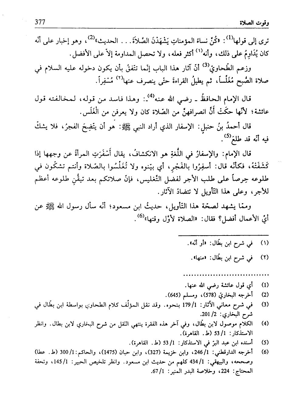 وممّا يشهد لصحّة هذا التّأويل، حديثُ ابن مسعودة أنّه سأل رسول الله - صلى الله عليه وسلم - عن أيِّ الأعمال أفضل؟ فقال: "الصلاة لأوَّل وقتها" (¬6).