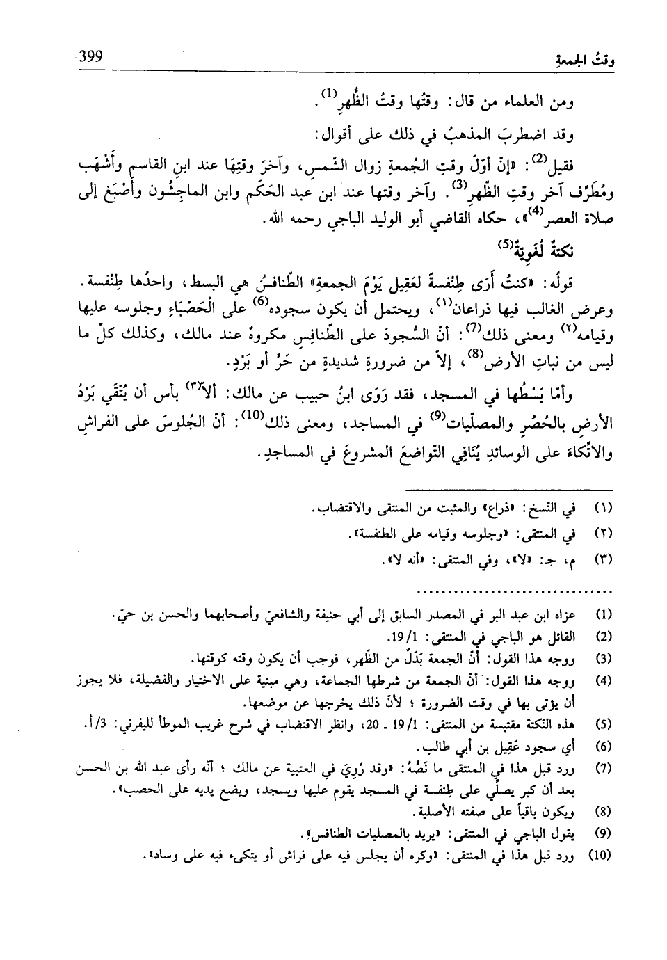 (¬9) يقول الباجي في المنتقي: "يريد بالمصليات الطنافس".