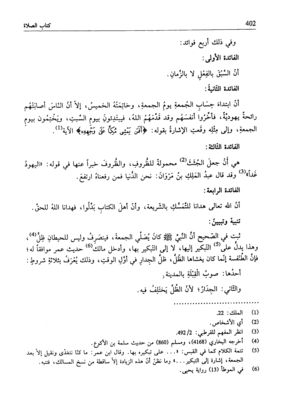 (¬5) تتمة الكلام كما في القبس: " ... على تبكيره بها. وقال ابن عمر: ما كنّا نتغدّى ونقيل إلّا بعد الجمعة، إشارة إلى التبكير. ..) وما نظنّ أنّ هذه الزيادة إلَّا ساقطة من نسخ المسالك، فتنبه.