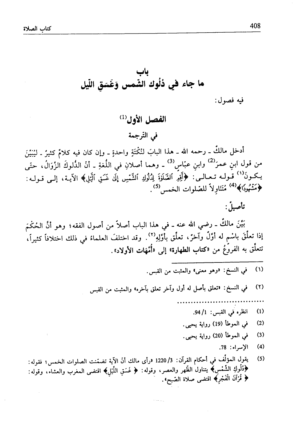 (¬5) يقول المؤلِّف في أحكام القرآن: 3/ 1220 "رأى مالكٌ أنّ الآية تضمّنت الصلوات الخمس؛ فقوله: {دُلُوكِ الشَّمْسِ} يتناول الظّهر والعصر، وقوله: {غَسَقِ اللَّيْلِ} اقتضى المغرب والعشاء، وقوله: {قُرْآنَ الْفَجْرِ} اقتضى صلاة الصّبح".