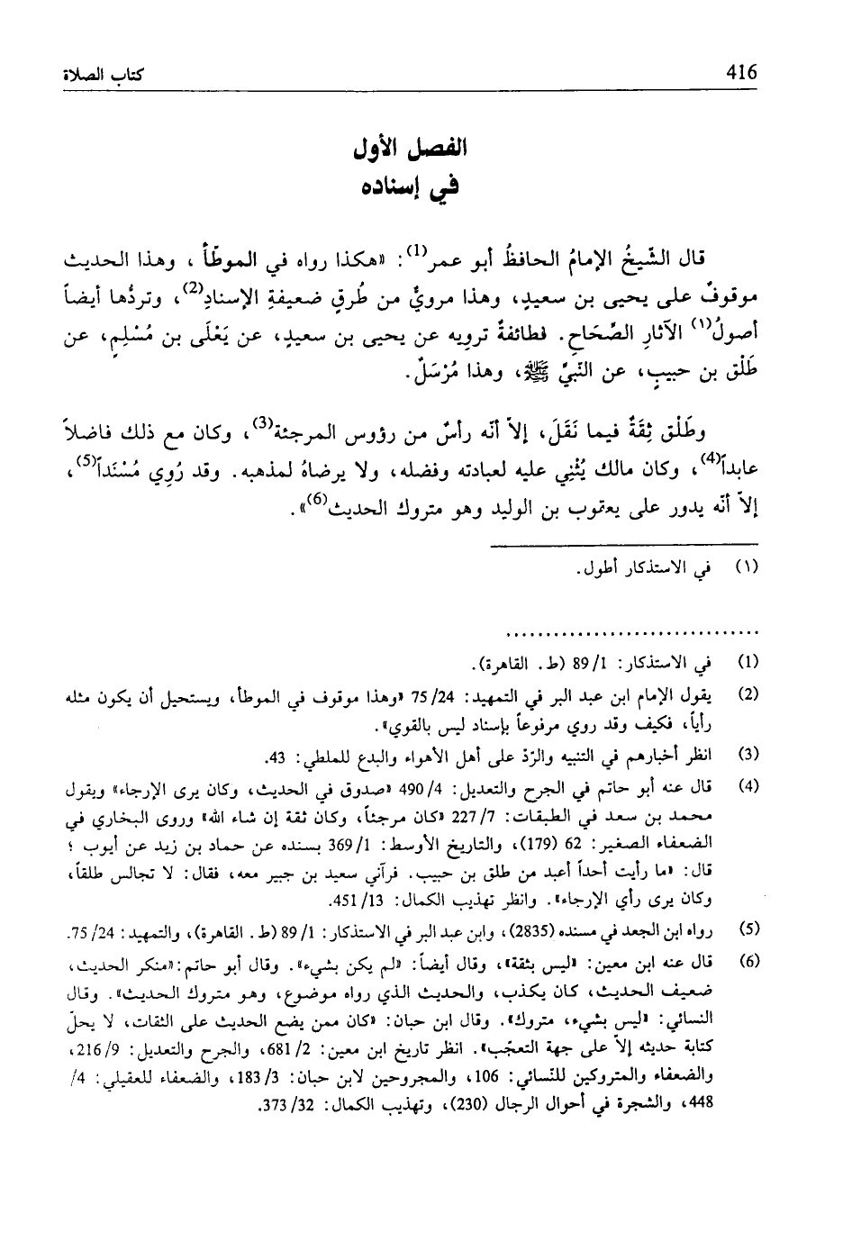(¬2) يقول الإمام ابن عبد البرّ في التمهيد: 24/ 75 "وهذا موقوف في الموطأ، ويستحيل أنّ يكون مثله رأيًا، فكيف وقد روي مرفوعًا بإسناد ليس بالقوي".