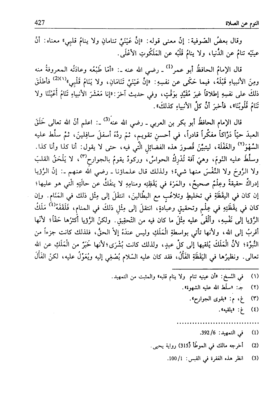 وقال بعضُ الصّوفية: إنّ معنى قوله: " إنّ عَيْنَيَّ تنامانِ ولا ينامُ قلبِي" معناه: أنّ عينَيْه تنامُ عن الدُّنيا, ولا ينامُ قَلْبُه عن المَلَكُوتِ الأعْلَى.