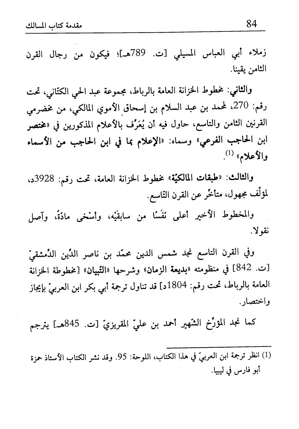 (¬1) انظر ترجمة ابن العربيّ في هذا الكتاب، اللوحة: 95. وقد نشر الكتاب الأستاذ حمزة أبو فارس في ليبيا.