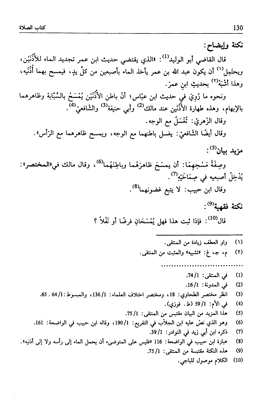 (¬8) عبارة ابن حبيب في الواضحة: 116 "فليس على المتوضيء أنّ يحمل الماء إلى رأسه ولا إلى أذنيه".