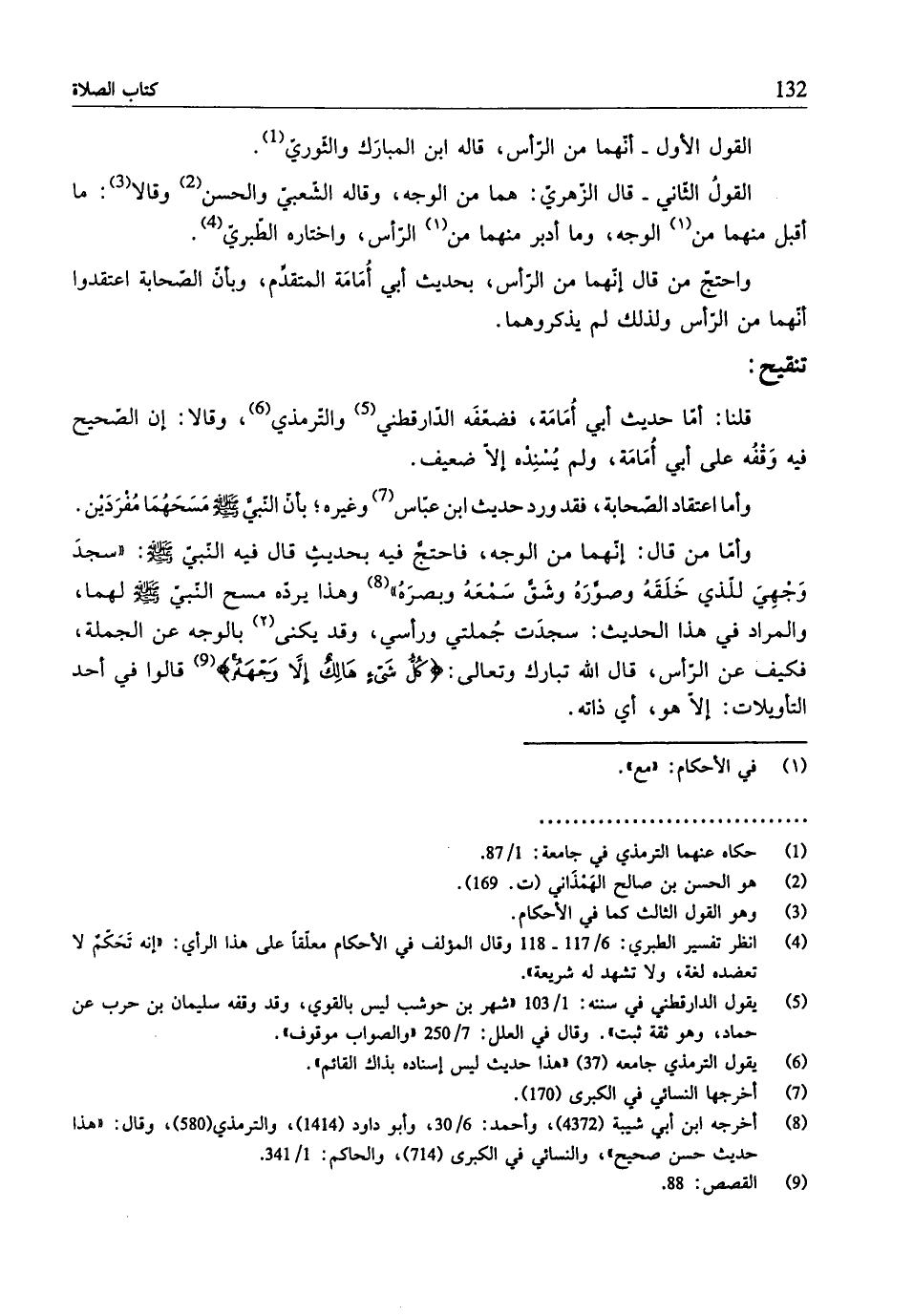 وأما من قال: إنّهما من الوجه، فاحتجَّ فيه بحديثٍ قال فيه النّبيّ -صلّى الله عليه وسلم-: "سجدَ وَجهِيَ للّذي خَلَقَهُ وصوَّرَهُ وشَقَّ سَمعَهُ وبصرَهُ" (¬8) وهذا يردّه مسح النّبيّ - صلّى الله عليه وسلم - لهما، والمراد في هذا الحديث: سجدَت جُملتي ورأسي، وقد يكنى بالوجه عن الجملة، فكيف عن الرّأس، قال الله تبارك وتعالى: {كُلُّ شَيْءٍ هَالِكٌ إِلَّا وَجْهَهُ} (¬9) قالوا في أحد التأويلات: إلَّا هو، أي ذاته.