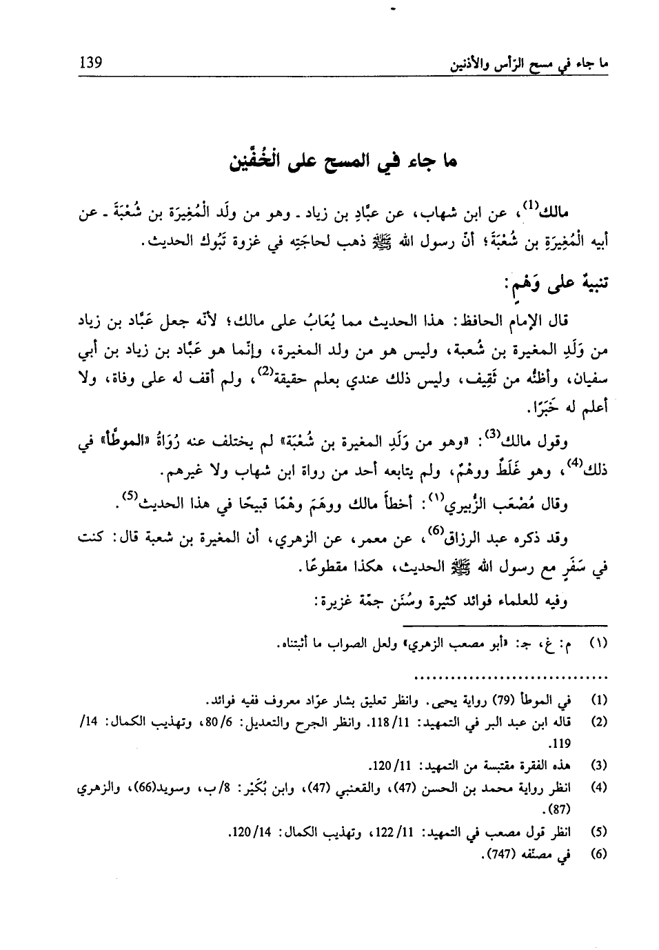 مالكٌ (¬1)، عن ابن شهاب، عن عبَّادِ بن زياد - وهو من ولَد المُغِيرَة بن شُعبةَ - عن أبيه المُغِيرَةِ بن شُعبَةَ؛ أنّ رسول الله -صلّى الله عليه وسلم- ذهب لحاجَتِه في غزوة تَبُوك الحديث.