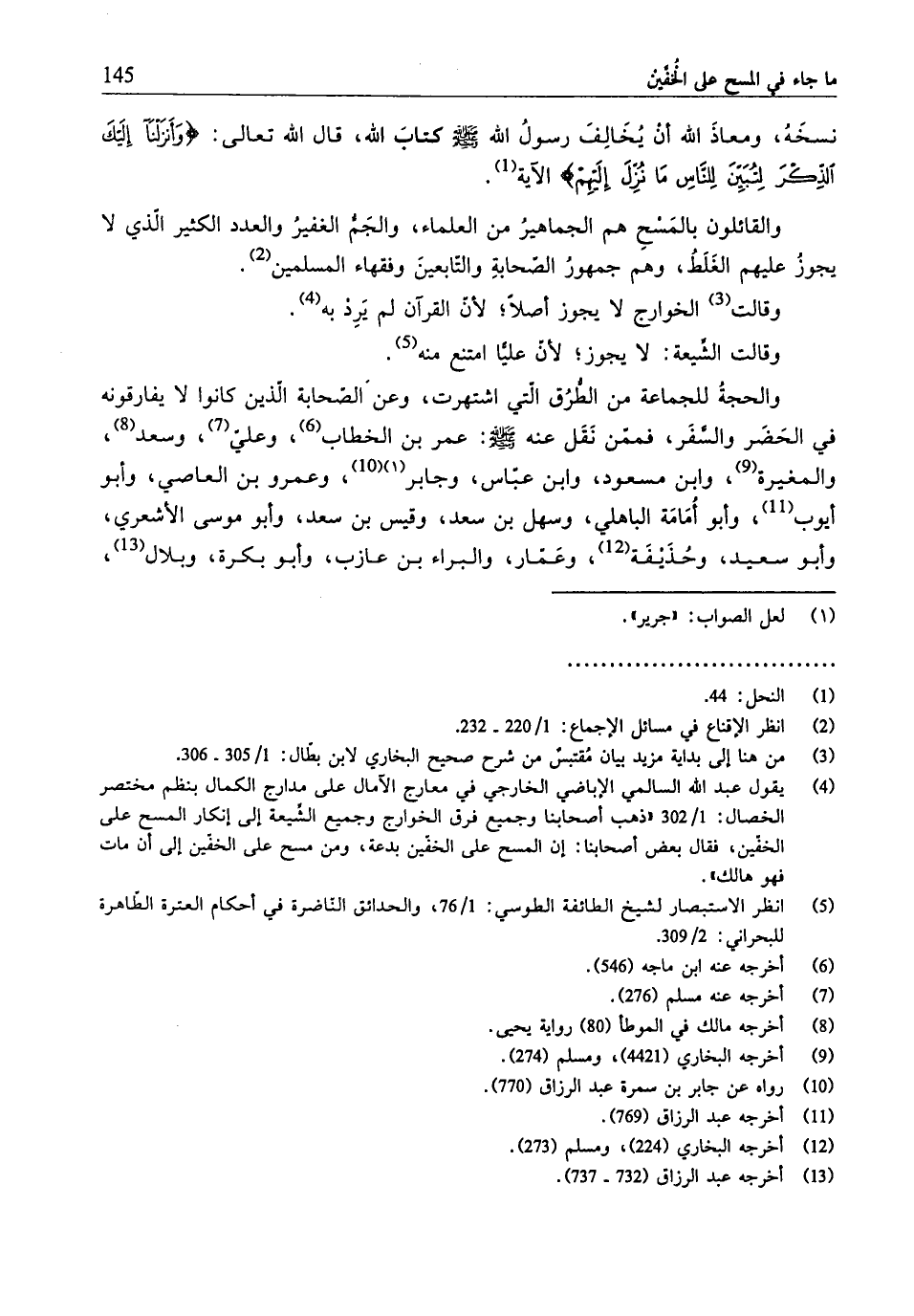 (¬4) يقول عبد الله السالمي الإباضي الخارجي في معارج الآمال على مدارج الكمال بنظم مختصر الخصال: 1/ 302 "ذهب أصحابنا: وجميع فرق الخوارج وجميع الشِّيعة إلى إنكار المسح على الخفّين، فقال بعض أصحابنا: إنّ المسح على الخفّين بدعة، ومن مسح على الخفّين إلى أنّ مات فهو هالك".