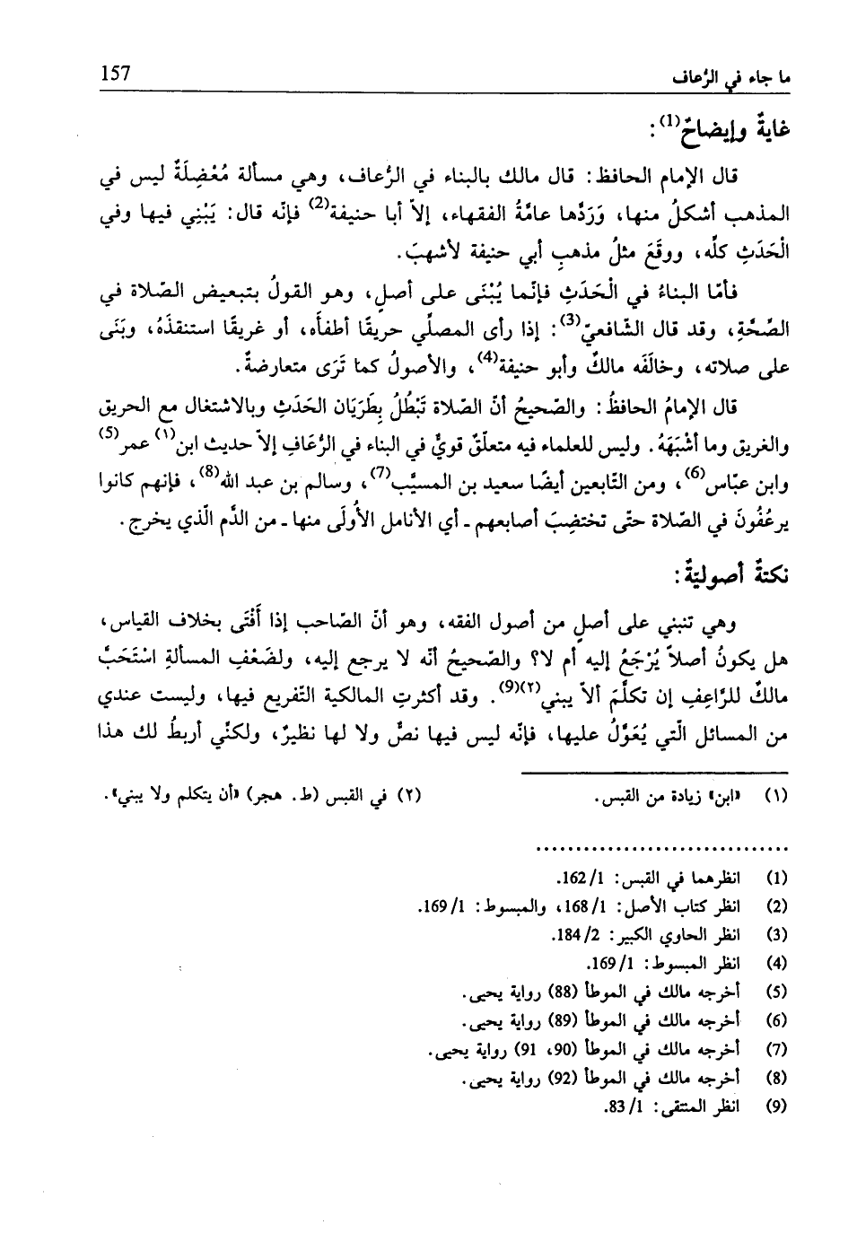 وهي تنبني على أصل من أصول الفقه، وهو أنّ الصّاحب إذا أَفتَى بخلاف القياس، هل يكونُ أصلًا يُرجَعُ إليه أم لا؟ والصّحيحُ أنّه لا يرجع إليه، ولضَعفِ المسألةِ استَحَبَّ مالكٌ للرَّاعِفِ إنّ تكلَّمَ ألَّا يبني (¬9). وقد أكثرتِ المالكية التّفريع فيها، وليست عندي من المسائل الّتي يُعَوَّلُ عليها، فإنه ليس فيها نصٌّ ولا لها نظيرٌ، ولكنِّي أربطُ لك هذا