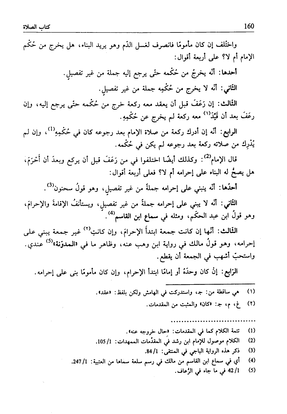واختُلف إنّ كان مأمومًا فانصرف لغسل الدَّم وهو يريد البناء، هل يخرج من حُكم الإمام أم لا؟ على أربعة أقوال:
