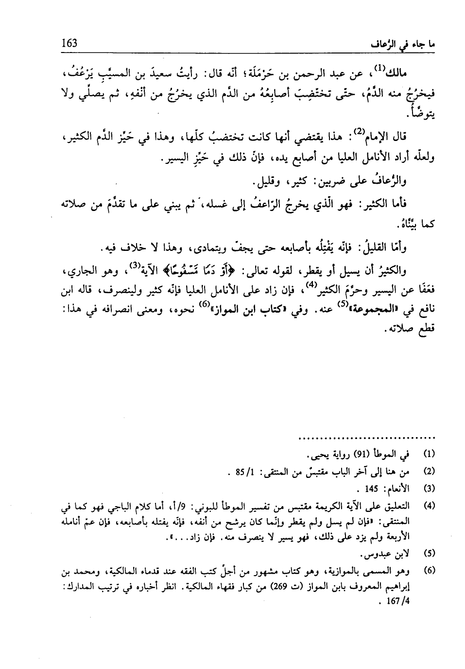 (¬4) التعليق على الآية الكريمة مقتبس من تفسير الموطَّأ للبوني: 9/ أ، أما كلام الباجي فهو كما في المنتقى: "فإن لم يسل ولم يقطر وإنّما كان يرشح من أنفه، فإنّه يفتله بأصابعه، فإن عمّ أنامله الأربعة ولم يزد على ذلك، فهو يسير لا ينصرف منه. فإن زاد ... ".