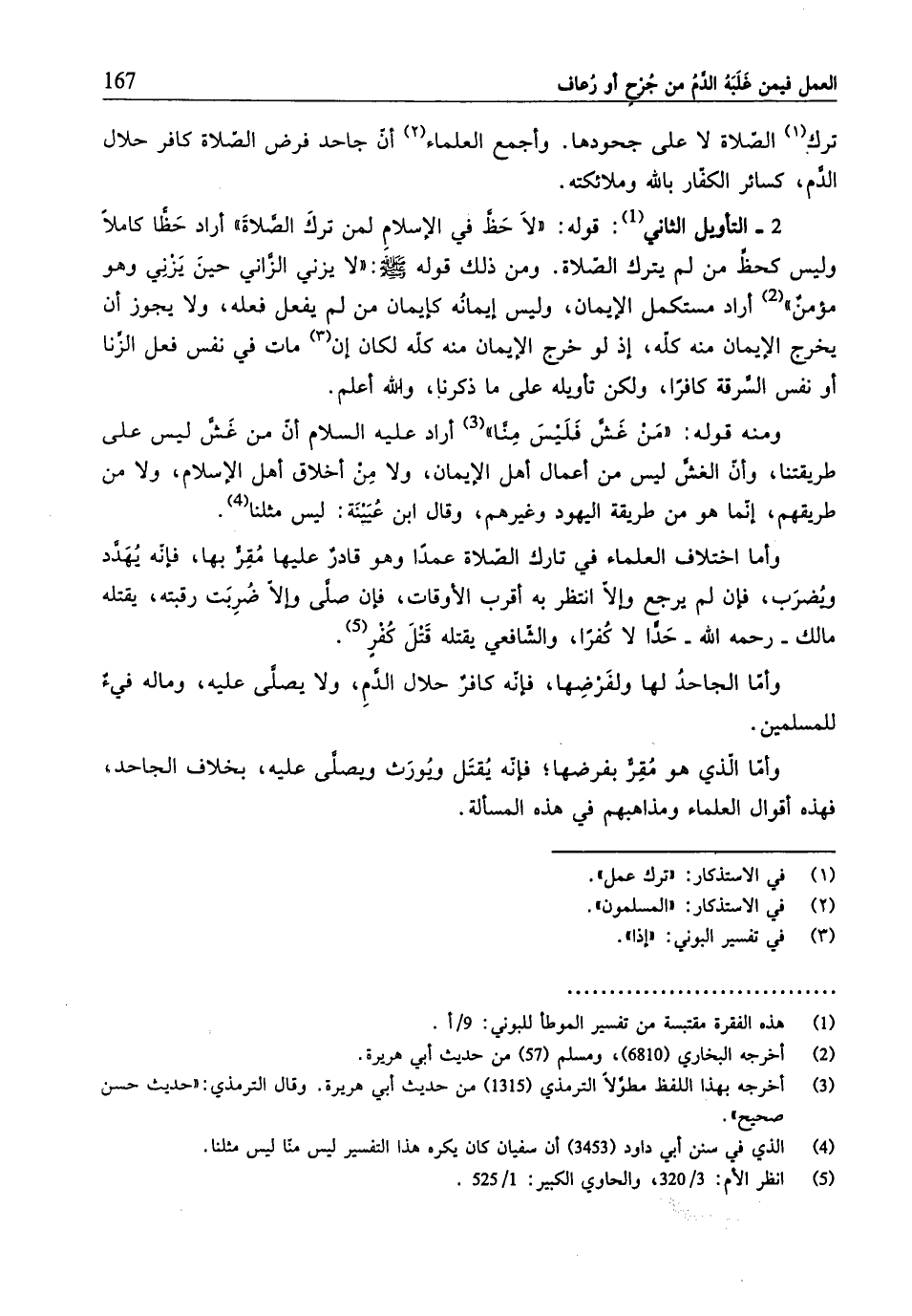 2 - التّأويل الثّاني (¬1): قوله: " لاَ حَظَّ في الإِسلامِ لمن تركَ الصَّلاةَ" أراد حَظًّا كاملًا وليس كحظ من لم يترك الصّلاة. ومن ذلك قوله - صلّى الله عليه وسلم -: "لا يزني الزَّاني حينَ يَزْنِي وهو مؤمنٌ" (¬2) أراد مستكمل الإيمان" وليس إيمانُه كإيمان من لم يفعل فعله، ولا يجوز أن يخرج الإيمان منه كلّه، إذ لو خرج الإيمان منه كلّه لكان إنّ مات في نفس فعل الزِّنا أو نفس السَّرقة كافرًا، ولكن تأويله على ما ذكرنا، والله أعلم.