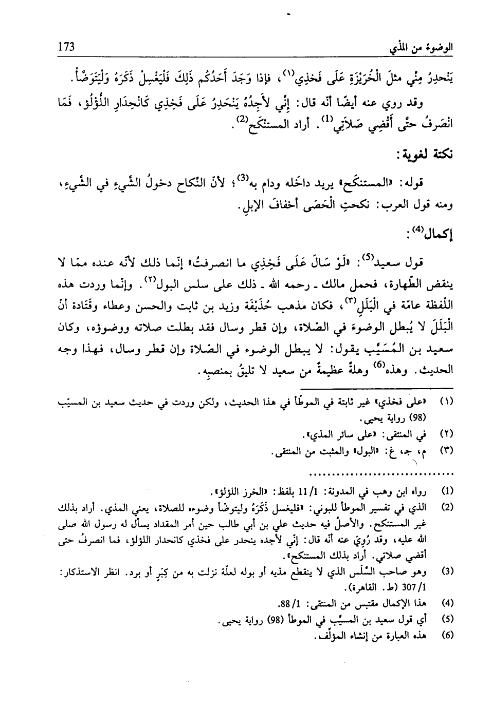 (¬2) الّذي في تفسير الموطَّأ للبوني: "فليغسل ذَكَرَهُ وليتوضّأ وضوءه للصلاة، يعني المذي. أراد بذلك غير المستنكح. والأصلُ فيه حديث علي بن أبي طالب حين أمر المقداد يسأل له رسول الله - صلّى الله عليه وسلم- وقد رُوِي عنه أنّه قال: إنّي لأجده ينحدر على فخذي كانحدار اللؤلؤ، فما انصرفُ حتّى أقضي صلاتي. أراد بذلك المستنكح".