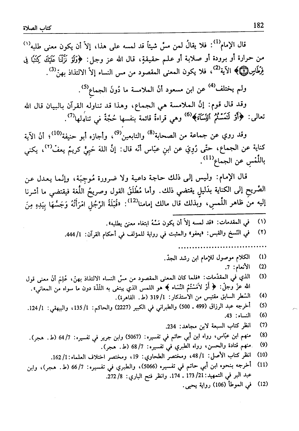 (¬3) الّذي في المقدّمات: "فلما كان المعنى المقصود من مسِّ النساء الالتذاذ بهنّ، عُلِم أنّ معنى قول الله عَزَّ وَجَلَّ: " {أَوْ لَامَسْتُمُ النِّسَاءَ} هو اللمس الّذي يبتغى به اللَّذَّة دون ما سواه من المعاني".