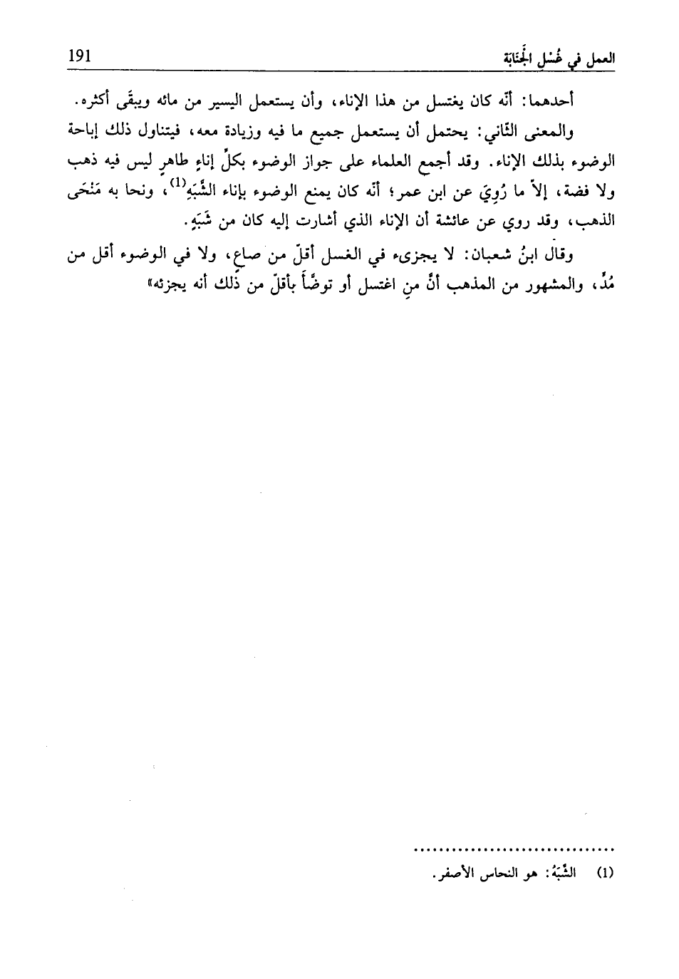 وقال ابنُ شعبان: لا يجزئ في الغسل أقلّ من صاعٍ، ولا في الوضوء أقل من مُدٍّ، والمشهور من المذهب أنَّ منِ اغتسل أو توضَّأ بأقلّ من ذلك أنّه يجزئه"