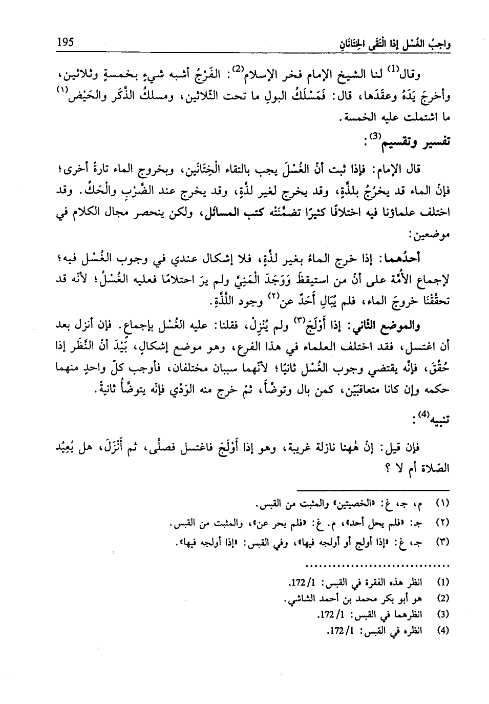 قال الإمام: فإذا ثبت أنّ الغُسْلَ يجب بالتقاء الخِتَانَين، وبخروج الماء تارةً أخرى؛ فإنْ الماء قد يخرُجُ بلذَّة، وقد يخرج لغير لذَّةٍ، وقد يخرج عند الضَّربِ والحَكِّ. وقد اختلف علماؤنا فيه اختلافًا كثيرًا تضمَّنَتْه كتب المسائل، ولكن ينحصر مجال الكلام في موضعين: