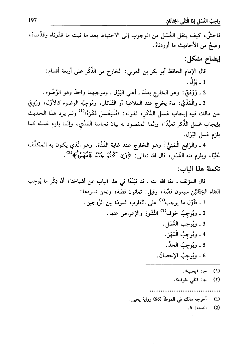 4 - والرّابع المَنِيُّ: وهو الخارج عند غاية اللَّذَّة، وهو الّذي يكون به المكلَّف جُنُبًا، ويلزم منه الغُسْل، قال الله تعالى: {وَإِنْ كُنْتُمْ جُنُبًا فَاطَّهَّرُوا} (¬2).