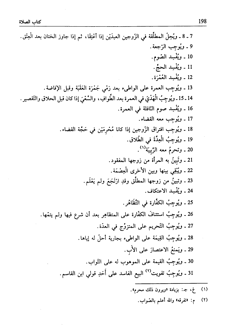 14 - 15 - وُيوجِبُ الهَديَ في العمرة بعد الطَّوافِ، والسَّعْيَ إذا كان قبل الحلاق والتّقصير.