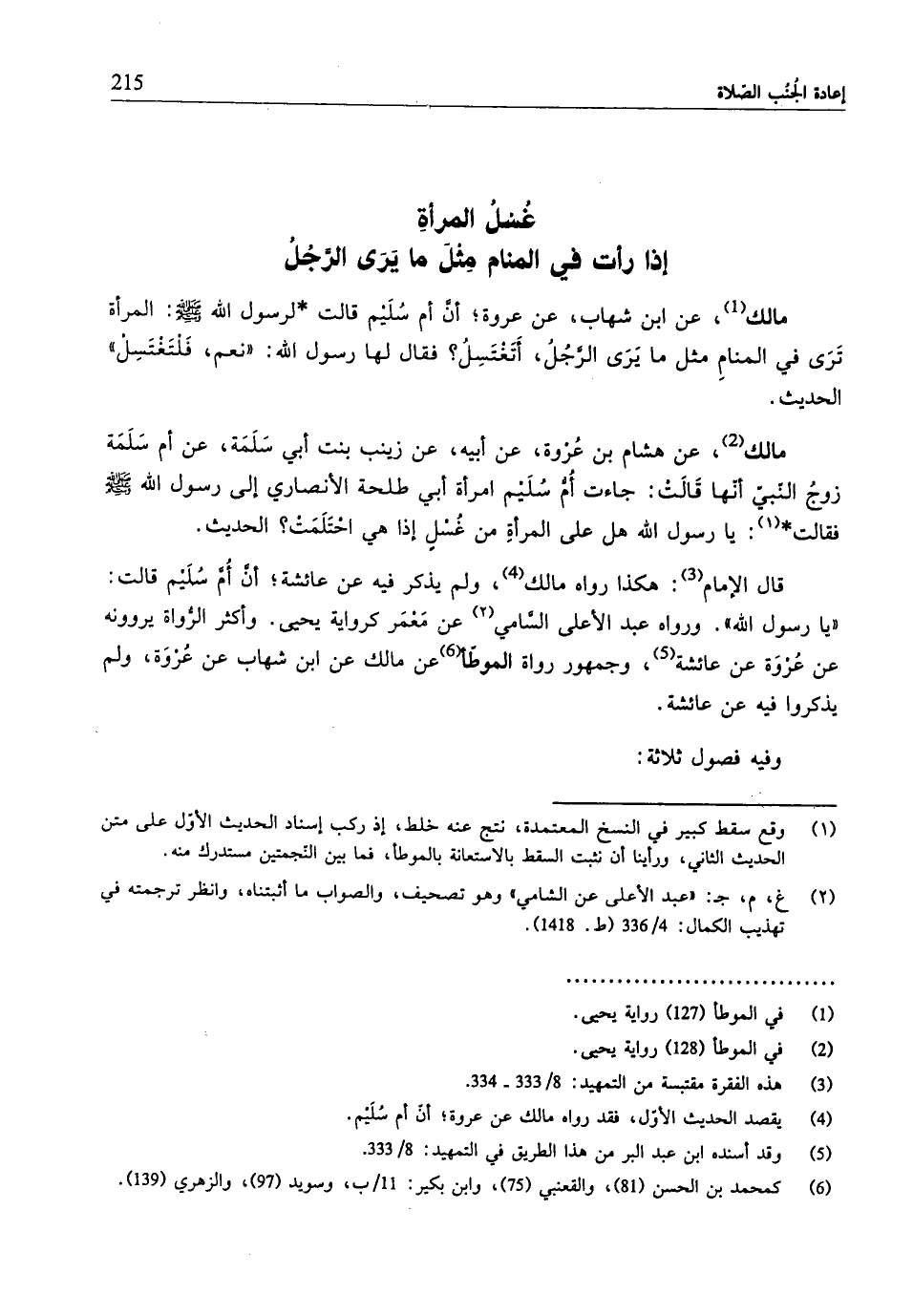 مالكٌ (¬1)، عن ابن شهاب، عن عروة؛ أنَّ أم سُلَيْم قالت *لرسول الله - صلّى الله عليه وسلم -: المرأة تَرَى في المنامِ مثل ما يَرَى الرَّجُلُ، أَتَغْتَسِلُ؟ فقال لها رسول الله -صلّى الله عليه وسلم-: "نعم، فَلتَغتَسِلْ" الحديث.