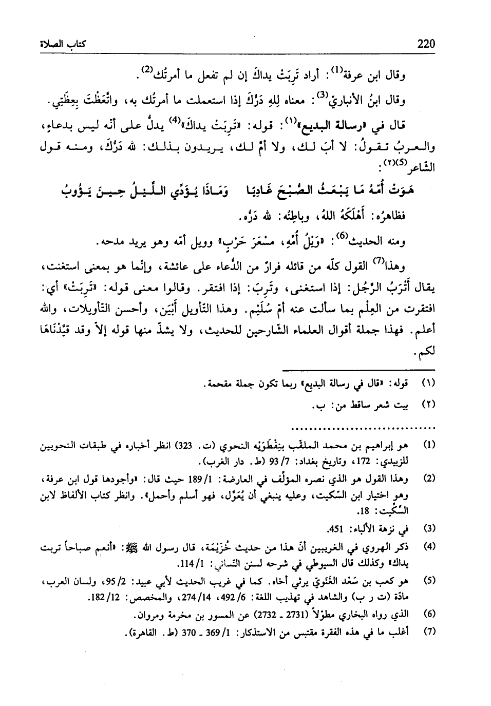 قال في "رسالة البديع": قوله: "ترِبَت يداكَ" (¬4) يدلُّ على أنّه ليس بدعاءٍ، والعربُ تقولُ: لا أبَ لك، ولا أمَّ لك، يريدون بذلك: لله دَرُّكَ، ومنه قول الشّاعر (¬5):