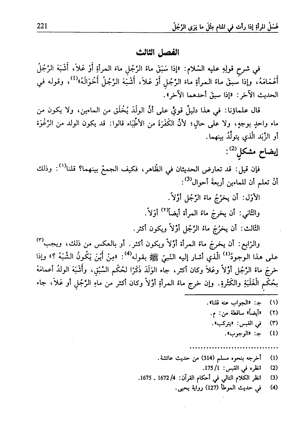 والرّابع: أن يخرجَ ماءُ المرأة أوَّلًا ويكون أكثر. أو بالعكس من ذلك، ويجب على هذا الوجودُ الّذي أشار إليه النّبيّ -صلّى الله عليه وسلم- بقوله (¬4): "من أَينَ يَكُونُ الشَّبَهُ؟ " وإذا خرجَ ماءُ الرَّجُل أوَّلًا وعَلاَ وكان أكثر، جاء الوَلَدَ ذَكَرًا لحُكم السَّبْقِ، وأَشبَهَ الولدُ أعمامَهُ بحُكمِ الغَلَبَةِ والكَثرةِ. وإن خرج ماءُ المرأةِ أوَّلًا وكان أكثر من ماءِ الرَّجُلِ أو عَلاَ، جاء