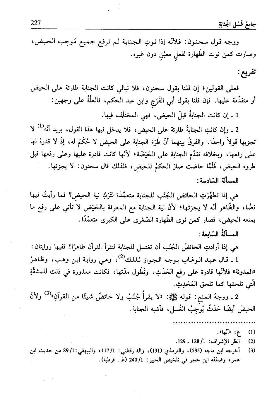 فعلى القولين؛ إنّ قلنا بقول سحنون، فلا نبالي كانت الجنابة طارئة على الحيض أو متقدِّمة عليها. فإن قلنا بقول أبي الفَرَجِ وابن عبد الحكم، فالعلَّةُ على وجهين: