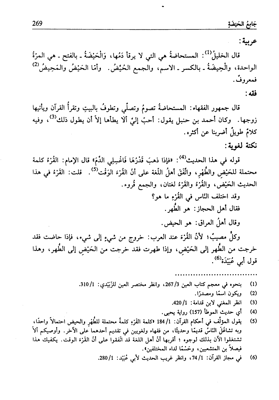 (¬5) يقول المؤلَّف في أحكام القرآن: 1/ 184 "كلمةٌ القرْءِ كلمة محتملة للطُّهْر والحيض احتمالًا واحدًا، وبه تشاغَلَ النّاسُ قديمًا وحديثًا، من فقهاء ولغويين في تقديم أحدهما على الآخر. وأوصيكم إلَّا تشتغلوا الآن بذلك لوجوه؛ أقربها أنّ أهل اللُّغة قد اتّفقوا على أنّ القَرْة الوقت. يكفيك هذا فيصلًا بن المتشعبين، وحَسْمًا لداء المختلفين".