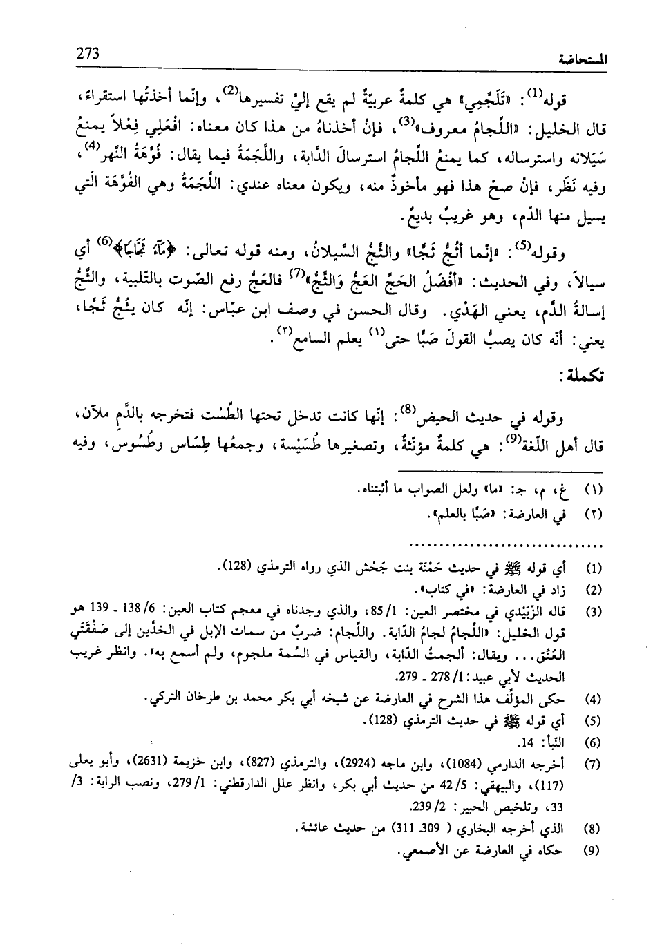 قوله (¬1): "تَلَجمِي" هي كلمة عربيّةٌ لم يقع إليَّ تفسيرها (¬2)، وإنّما أخذتُها استقراءً، قال الخليل: "اللَّجامُ معروف" (¬3)، فإن أخذناهُ من هذا كان معناه: افْعَلِي فِعْلًا يمنعُ سَيَلانه واسترساله، كما يمنعُ اللَّجامُ استرسالَ الدَّابة، واللَّجَمَةُ فيما يقال: فُوَّهَةُ النَّهر (¬4)، وفيه نَظَر، فإن صحّ هذا فهو مأخوذٌ منه، ويكون معناه عندي: اللَّجَمَةُ وهي الفُوَّهَة الّتي يسيل منها الدَّم، وهو غريبٌ بديعٌ.